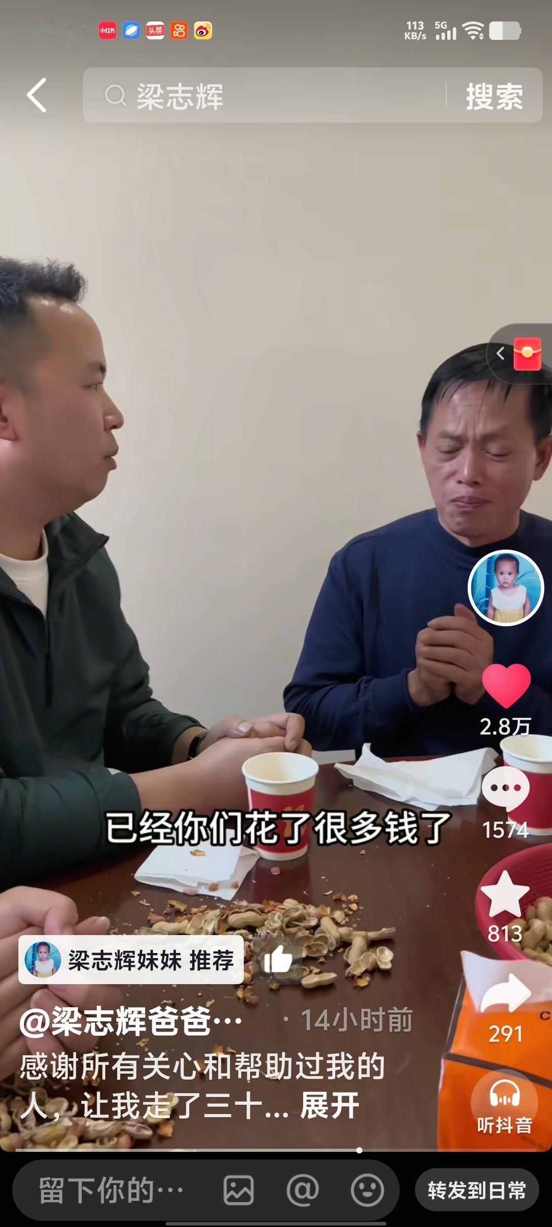 梁志辉即将回家!爸妈要高调团圆:让儿子挺胸抬头,这是我们欠你的 梁志辉马上就要回来了,梁爸爸说自己没有保护好儿子,这次要风风光光的把他接回家。 要让儿子挺胸抬头的回来,你不是爸爸妈妈不要的孩子,这是爸爸妈妈欠你的。 妈妈说儿子想低调一些,想为我们省点钱。但是我想高调认亲,让那些还没有上岸的家长们都来,让那些孩子都站出来。 梁爸爸提到了谢浩楠,解清帅,苏伢子当年这些孩子对自己的帮助。 那两个给梁爸爸家装修的好心人,要拿钱出来给他们办团圆喜宴。就算梁爸爸借的 等他赚钱以后再还。梁爸爸才肯接受。评论区也有不少人,让他抓紧办吧,然后借着流量带带货,改善一下家庭状况。 看了这样的视频,应该好事将近了。也祝他们早日团圆。