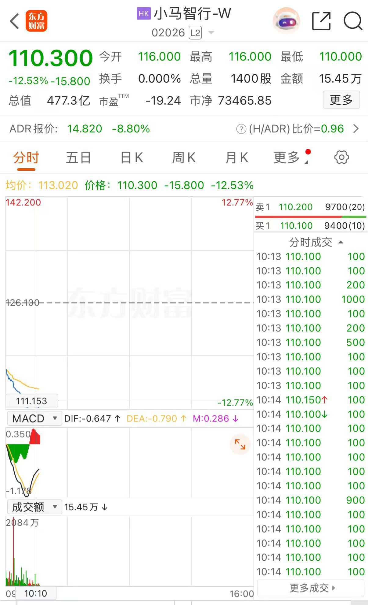 同日,小马智行开盘一度跌超12%,最低报110港元/股。截至10点10分,小马智行跌12.53%,报110.3港元/股,总市值约477.3亿港元。