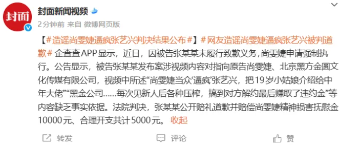 据封面新闻,企查查APP显示,近日,因被告张某某未履行致歉义务,尚雯婕申请强制执行。