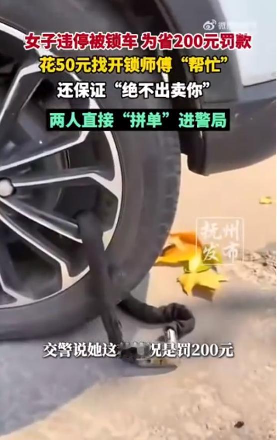 河南许昌,女子违停被交警上锁,罚款200元。女子不想交钱,花了50块钱联系开锁师傅帮忙。起初开锁师傅还有些犹豫,女子便承诺,绝不会出卖你。结果悲剧了,俩人“拼单”进了警局。 “没事的,你先给我开锁,就算有什么事我也绝不会出卖你。”女子低声对那位开锁师傅说,一副信任满满的样子,却没想到自己的“小聪明”一点用处都没有。 事情起源并不复杂,这位女子因为乱停乱放,被交警依法锁车处理。她知道自己需要缴纳200元的罚款才能将车解锁并取走,可是她并不愿意这么做:觉得罚款金额不小,于是动了“另辟蹊径”的念头。 于是,她花了50元联系了一位开锁师傅,希望其帮忙私下解锁。师傅最初还有犹豫,因为他知道这种行为有法律风险,但在利益诱惑及女子‘我绝不出卖你’的承诺下,答应开锁”。至此事情到了“悲剧”阶段,最终不只是女子一人受到处罚,师傅也因协助违法行为被带走。 从旁观者的角度来看,这件事虽小,却折射出几个值得思考的问题。首先是“逃避”与“短视”的心理:当女子面临明确的行政处罚时,可能觉得自己能够“赖”掉这笔罚款,想要以更小的代价来解决车辆被锁的问题,最终害人害己。 其次是法律意识与风险认知不足,开锁师傅虽然知道有违法风险,但在金钱诱惑与信任保证面前,还是选择了参与,导致自己不仅没有赚到那笔收入,还承担了责任。而且女子对师傅说“没事的,我绝不会出卖你”,但这种承诺实际上并没有任何作用。 其实这种处罚是为了维护地面交通秩序、保障其他车辆与行人通行环境。也许女子觉得只是一辆车、一张罚单,不是什么大事,但在“合规执行”这个体系里,就是一环。每一辆车的乱停乱放、每一次私解锁具,都可能累积成秩序缺失。 总的来讲,这起在许昌发生的小事件,虽无轰轰烈烈的背景,却具备典型意义:一个人为省200元罚款,最终支付了50元却引出更多麻烦。 这种“想省钱反被省”的情形,在生活中并不罕见。希望借此案例,更多人能够意识到:合法、正规的处理方式虽然有成本,但规避方式的隐形成本往往更高。愿每位车主在面对处罚时,既有规避风险的智慧,也有尊重法规的态度。 信息来源: 环球网丨女子违停被锁车,竟花50元找开锁师傅,还保证“绝不出卖”,最终两人双双进警局 文丨小王 编辑丨史叔