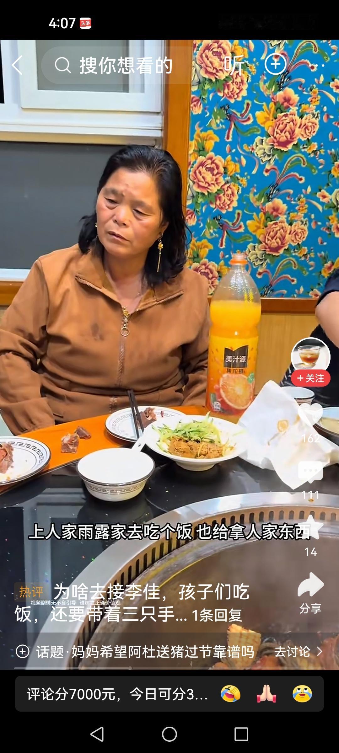 老壳子为什么会在直播间站一天? 每到李佳直播带货,老壳子准时到场,即使站在门外,也给李佳添人气,老壳子不来,一万以里的人在直播间,老壳子来了,两万以里的人在直播间。 还是看热闹的多,看老壳子怎样没面子,抢吃抢喝,丢人现眼的? 下了播,吃饭去,还是甩不掉,带着一起去吃饭。 直播间剩下的食品,还是她拿走。 看李佳穿的衣服,和婆婆穿的衣服一样,是不是李佳给的,没有视频为证。