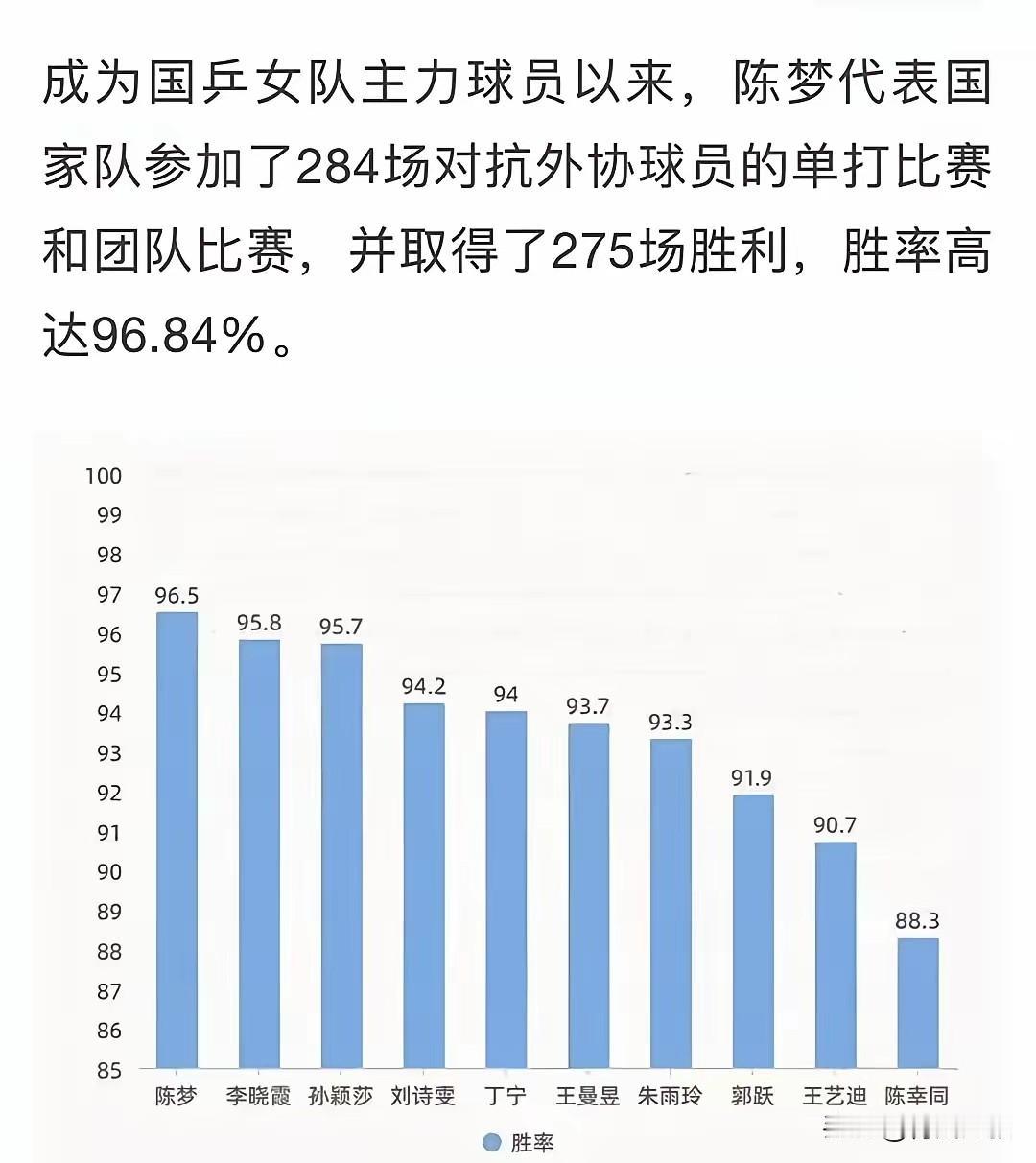 为什么陈梦参加全运会后,央视立马独家采访? 以前看自媒体多了, 以为陈梦外战成绩不好呢, 动不动就说, 她无锡亚洲杯输给平野美宇, 貌似每次都是保送进的决赛, 但是一查成绩, 发现不对了。 她才是外战胜率最高的人, 96.5%的胜率, 有统计以来最好成绩!