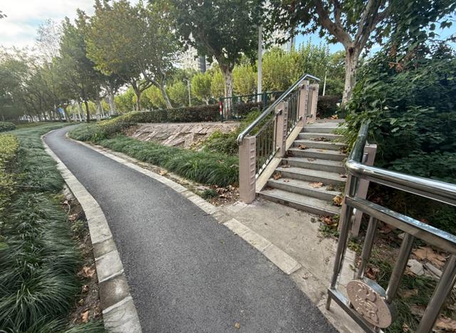 但东侧道闸装上了,西侧的步道却依旧敞开,这里就此成了非机动车新的“近路”。记者走上西侧步道后发现,这一步道两端均与人行道直接相连,与西泰林路相连的一端设置了台阶,但同时也有坡道直接通向人行道,这本应是给行人提供的无障碍通道,但在记者走访期间,不少人骑着电动车娴熟地从西泰林路的非机动车道骑上人行道,随后通过坡道进入同汾泾健康步道西侧路段。