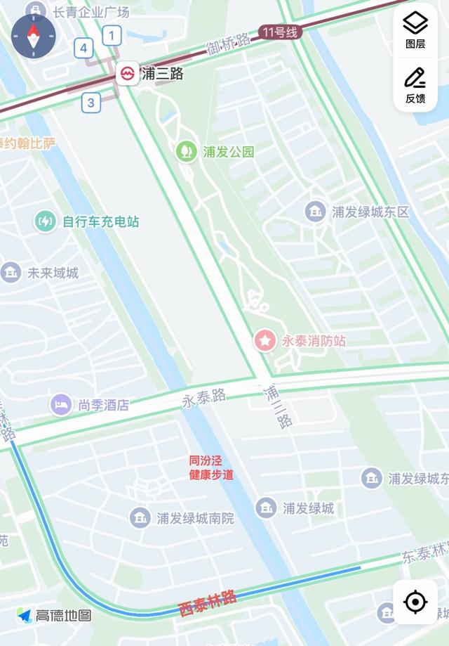 问题不止于此。从地图上看,东泰林路和西泰林路首尾相接呈环形,永泰路和西泰林路间没有南北向的通路,非机动车如果想从西泰林路南侧部分到达永泰路或浦三路,只能沿西泰林路绕行,这种情况下,图方便且为了省时间,不少快递员、外卖骑手和附近居民便骑着电动车从步道穿行,这便是东侧河岸安装蛇形道闸的原因。