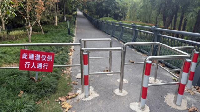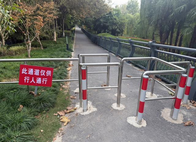 两端的蛇形道闸口都张贴了醒目的告示:“此通道仅供行人通行。”蛇形道闸从路面铺设至草坪中,另一侧与步道的护栏相连,将步道的入口完全拦住。记者查看发现,这一道闸并无可供开启的闸门,这就导致了市民反映的情况:非机动车过不去了,但轮椅和婴儿车等同样也被拦在步道外。