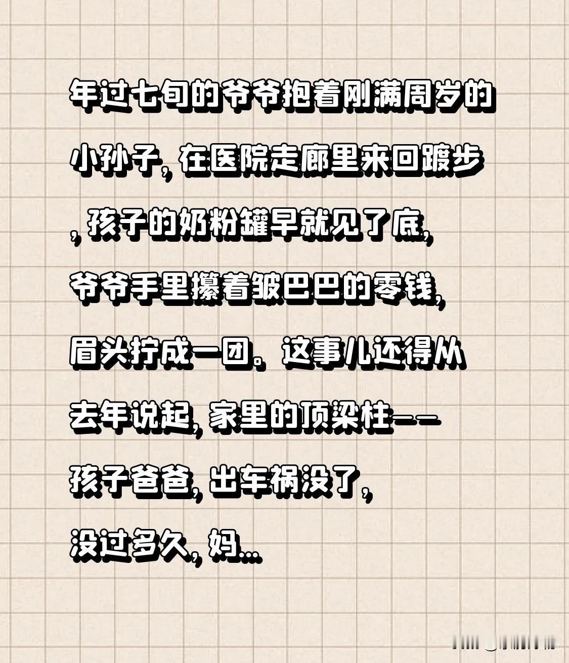 年过七旬的爷爷抱着刚满周岁的小孙子,在医院走廊里来回踱步,孩子的奶粉罐早就见了底,爷爷手里攥着皱巴巴的零钱,眉头拧成一团。这事儿还得从去年说起,家里的顶梁柱——孩子爸爸,出车祸没了,没过多久,妈妈也不见了踪影,就剩下爷爷靠着手里的养老金,一点点熬着日子。 前几天乡政府的工作人员去家里走访,才发现这爷孙俩的日子过得有多难:桌上总摆着一碗稀粥,几片咸菜,爷爷却把盘子里的肉片都夹给了小孙子,小家伙抓着肉啃得满嘴油,爷爷就在旁边嘿嘿笑。现在好了,政府已经在帮祖孙俩办低保了,每个月能多领好几百块,日子能松快不少。村里的邻居们也你送点青菜、他递件旧衣服,让这个本来空荡荡的家,慢慢有了人气儿,看着就暖和。 生活里总有些没想到的坎儿,但好心人从来没少过。每次看见爷爷颤巍巍地冲奶粉,小孙子抱着奶瓶咯咯笑,突然就想起一句话——世上只有一种英雄主义,就是看清生活的难之后还笑着往前奔啊! 这让我想起老家邻居张叔,儿子工伤走了后他一个人带大孙女多年了现在孙女考上重点高中他逢人就说再苦也值了像这样带着孙辈过日子的老人最需要咱们帮点啥? 孙子的暖心 带小孙子的老人 孙子的暖心之举 孙子的暖心话 孙子的生活点滴 孙子的爷爷 孙子的奶奶