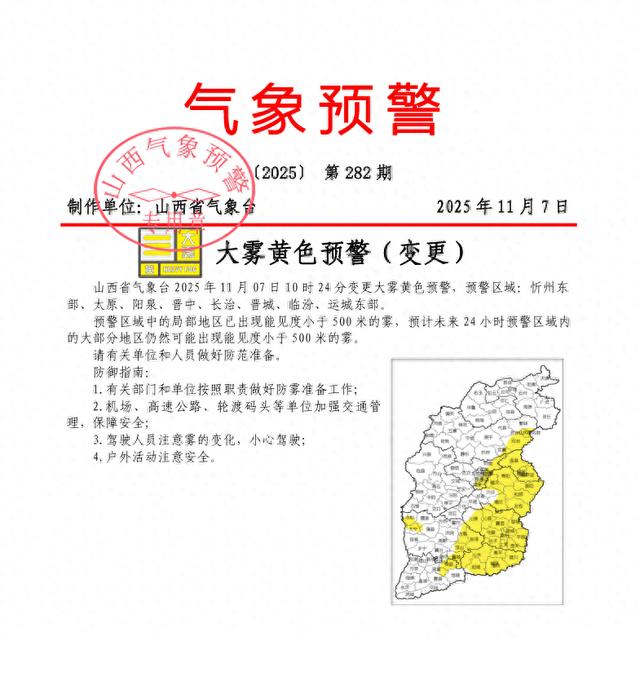 山西省气象台2025年11月07日10时24分变更大雾黄色预警,预警区域:忻州东部、太原、阳泉、晋中、长治、晋城、临汾、运城东部。