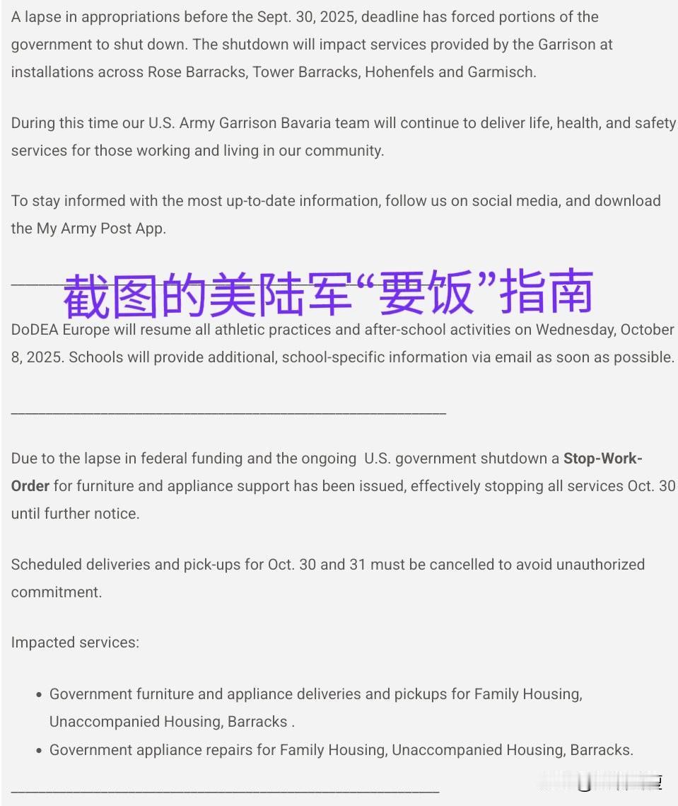 尴尬啊!断薪一个半月的37000名驻德美军昨天收到官方通知,他们得去跟德国人讨饭生活: 美陆军官方网页昨日介绍了当前停摆情况,确认11月15日依旧不会发薪,且德国当地社会保障并不适用于驻德美国士兵 ——于是他们建议驻德美军士兵到巴伐利亚州当地向贫困人士分发慈善食物的福利机构获取粮食,并列出了机构列表和地址。 ——最后他们还列出了如何低价购买商店和餐馆处理的过期食物的app。 由于被群嘲太厉害,美陆军很快扯下了建议。然而已经太晚了 ,“他们派了一群大兵去国外四处要饭哈哈哈哈”,全世界的嘲笑还在继续。