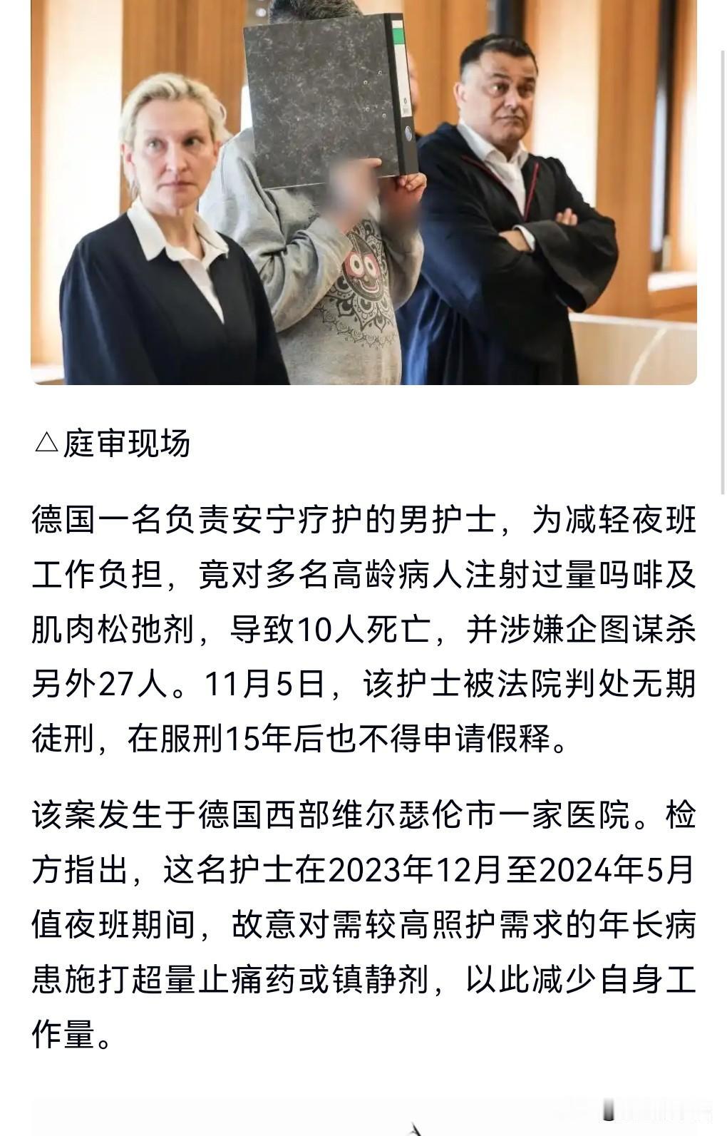 这也太丧心病狂了吧。 11月7日在网上看到一个令人震惊的事情。 德国男护士因夜班太忙谋杀10名病人,还企图杀27人。 外国对杀人犯够仁慈的,杀这么多人都不用死刑的。 觉得自己太忙就把这些人给杀死,这真的是泯灭人性。