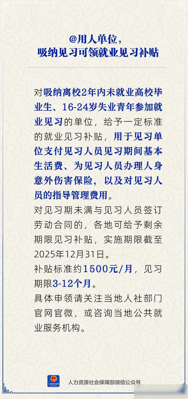 对见习期未满与见习人员签订劳动合同的,各地可给予剩余期限见习补贴,实施期限截至2025年12月31日。