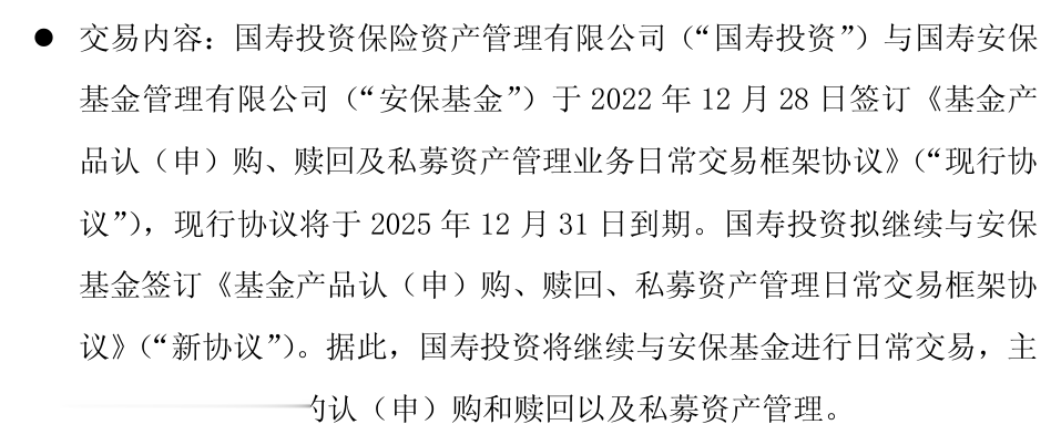 国寿投资与安保基金2022年12月28日签订的《基金产品认(申)购、赎回及私募资产管理业务日常交易框架协议》同样将于2025年12月31日到期,新协议将继续围绕基金产品认申购、赎回及私募资产管理展开,国寿投资及其子公司将根据自身投资规定,认申购或赎回安保基金管理的货币市场基金、债券型基金等各类产品,并支付相关费用,私募资产管理业务则由安保基金担任资产管理人,按约定收取管理费;2026年至2028年,该合作项下基金产品认申购金额及相关费用、赎回金额及相关费用年度上限均为20亿元,私募资产管理业务管理费年度上限为2000万元。