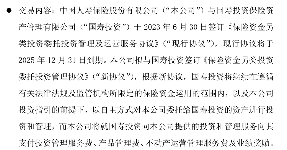 其中第一则公告显示,中国人寿与国寿投资拟续展保险资金另类投资委托管理合作,双方2023年6月30日签订的《保险资金另类投资委托投资管理及运营服务协议》将于2025年12月31日到期,新协议《保险资金另类投资委托投资管理协议》约定,国寿投资将在法律法规、监管要求及中国人寿投资指引范围内,自主管理委托资产,涵盖保险资产管理产品、金融产品、股权/不动产基金及公募REITs等,提供从项目筛选、尽职调查到后续管理及退出的全流程服务,中国人寿则需按约定支付投资管理服务费、产品管理费、不动产运营管理服务费及业绩奖励,部分新增项目投资管理服务费统一按年0.08%计算;2026年至2028年,该合作项下新增委托投资管理资产签约金额上限分别为1200亿元、1400亿元、1500亿元,投资和管理服务相关费用上限分别为11亿元、12亿元、13亿元。
