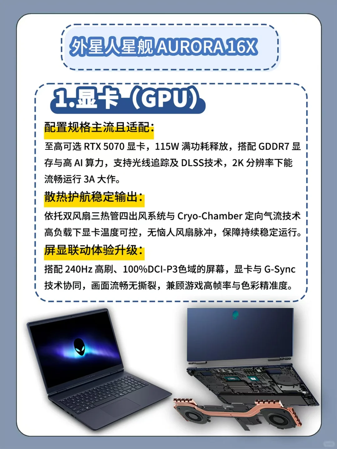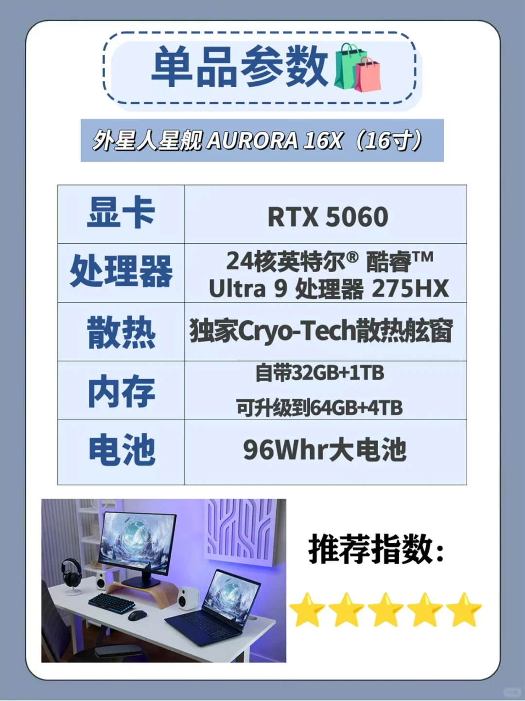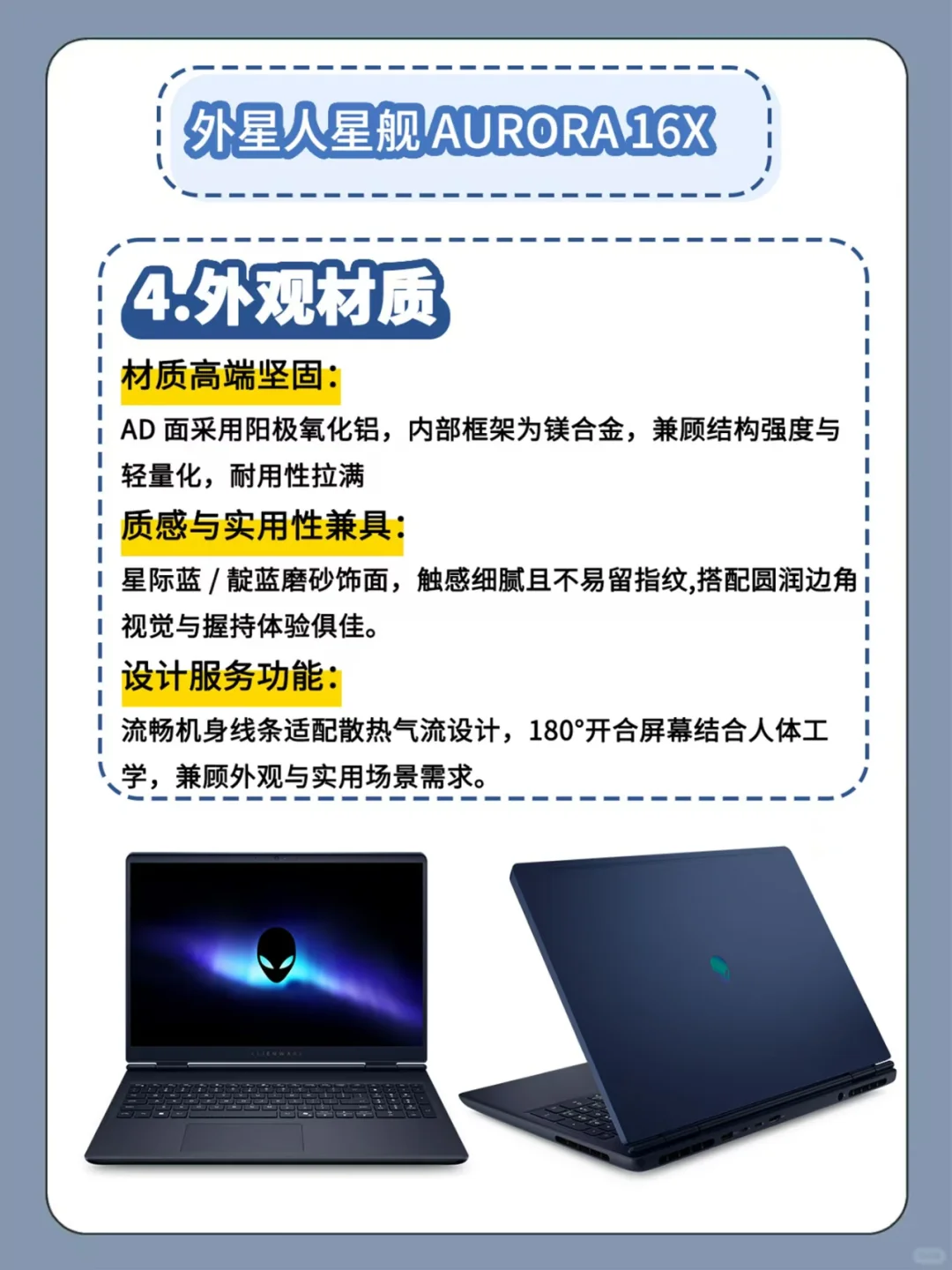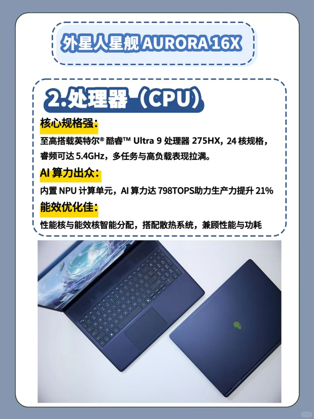 游戏党、设计咖快看过来!如果你在找一台万元级的高性能笔记本,那外星人星舰 AURORA 16X 绝对能戳中你的心巴❤️ 第一眼就被颜值拿捏得死死的,妥妥的行走颜值担当,酷炫感直接拉满💥 机身 AD 面是阳极氧化铝材质,内部框架搭配镁合金,又坚固又轻便,耐用性拉满👍星际靛蓝磨砂饰面,触感细腻还不容易留指纹,圆润的边角设计,视觉和握持感都超棒~机身线条流畅,还适配了散热气流设计,180° 开合的屏幕很贴合人体工学,外观和实用性都狠狠拿捏了👏 再看配置,这台本子的显卡直接拉满,最高可选 RTX 5070,满功耗释放,搭配 GDDR7 显存和高 AI 算力,光线追踪、DLSS 技术统统安排上,2K 分辨率下玩 3A 大作丝滑到飞起🎮 再配上双风扇三热管四出风系统和 Cryo-Chamber 定向气流技术,高负载下显卡温度稳稳的,风扇也不会吵到你,游戏体验直接拉满~ 处理器更是硬核,搭载英特尔® 酷睿™ Ultra 9 处理器 275HX,24 核规格,睿频冲到 5.4GHz,多任务处理、高负载运行都不在话下。 💪 内置的 NPU 计算单元,AI 算力高达 798TOPS,生产力直接提升 21%,剪视频、做设计效率翻倍!性能核和能效核智能分配,再加上给力的散热系统,性能和功耗平衡得刚刚好~ 屏幕这块也很绝!100% DCI-P3 电影级色域+100% sRGB 色域,色彩表现绝绝子,不管是打游戏还是做设计都够用🎨 实测平均 ΔE 低至 1.31,色彩还原精准到没朋友,修图剪片再也不用担心色差啦~500 尼特高亮度,就算在强光下,画面色彩也依旧清晰,电竞、设计多场景都能 hold 住! 内存和存储也很顶,自带32GB+1TB,支持升级到64GB+4TB,不管是存游戏还是存设计文件都妥妥的💾 还有 96Whr 大电池,续航也很给力~ 总之,外星人星舰 AURORA 16X 从配置、性能到外观、屏幕,每一处都透着 “高端” 二字,万元价位能有这样的表现,真的很难不爱!预算充足的宝子们,冲就完事儿了!💥