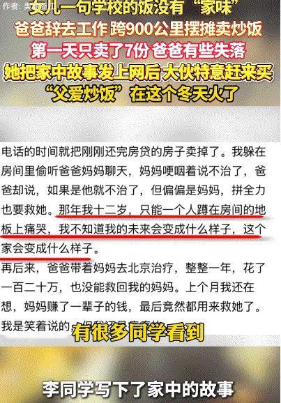 天津一女孩到吉林上大学,期间女孩因对父亲说了一句“学校的饭没有家的味道”,女孩父亲便辞职从天津到吉林,在女孩的学校门口摆摊,卖起了女孩平日里最爱吃的炒饭,可摆摊第一天,父亲的摊位却只卖了7份炒饭。女孩做了一件事后,让炒饭摊前围满了人。 吉林某高校门口的小吃街,刚出锅的炒饭香气裹着晚风散开,李同学站在人群外,看着父亲的 “天津炒饭” 摊位前围得水泄不通,眼泪瞬间涌了出来。排队的同学手里攥着手机,屏幕上正是她前一天发的帖子,而父亲正笨拙却认真地颠着铁锅,额角的汗珠顺着鬓角滑落,脸上却挂着连日来第一个舒展的笑容。 这一切的起点,只是女孩随口的一句话。李同学从天津到吉林上大学,开学没多久就跟父亲视频时抱怨,“学校的饭菜再香,也没有家里的味道”。电话那头的父亲没多说什么,可挂了电话就开始盘算 —— 他在天津一家机械厂干了十几年,虽说收入稳定,但女儿的话像根针,扎得他心里发紧。 没等女儿放寒假,他就递交了辞职信,带着家里的铁锅和秘制酱料,跨越 900 多公里来到吉林。 找摊位、备食材、熟悉环境,父亲花了三天时间把一切安顿好。出摊第一天,他特意穿了件干净的蓝色外套,把摊位擦得锃亮,从下午四点等到晚上八点,只卖出 7 份炒饭。 收摊时,他把剩下的食材仔细装进保鲜盒,嘴上跟女儿说 “第一天都这样,慢慢来”,可收拾工具的动作明显慢了半拍,连颠勺时都没了往日的力气。 看着父亲失落的背影,李同学回到宿舍就打开了手机,把父亲辞职来陪读摆摊的事写了下来。她没配华丽的图片,只拍了父亲布满老茧的手和那口带着划痕的铁锅,文字里全是日常的细节:父亲为了凑她的学费在工厂加班,小时候总变着花样给她做炒饭,这次来吉林连厚外套都没带够。帖子发出去不到一夜,就被转发了几千次,评论区里全是暖心的留言。 第二天下午,父亲刚把摊位支起来,就有同学带着手机找过来,“大叔,来一份招牌炒饭,要跟你女儿视频里一样的味道”。紧接着,人越来越多,队伍从摊位口一直排到了小吃街尽头,有同校的学生,有从长春市区特意赶来的网友,还有隔壁摊位的老板主动搬来凳子让大家歇脚。 父亲的动作有些跟不上,炒完一份就要擦一把汗,可脸上的笑意藏不住。有同学等了近一个小时也没抱怨,拿到炒饭后还特意跟他说 “大叔,比我家里做的还香”;有人扫码付款时多转了钱,留下一句 “给妹妹加个鸡腿” 就转身离开;还有社团的同学主动帮着维持秩序,大声喊着 “大家别急,每份都保证是家的味道”。 不到晚上七点,父亲备的食材就卖光了,营业额比第一天翻了十几倍。收摊时,他数着钱,突然跟女儿说 “太多人照顾生意了,心里实在过意不去”。李同学赶紧又发了条帖子,感谢大家的同时特意说明,“希望大家是真的喜欢炒饭,不用为了支持特意过来,爸爸也想靠手艺吃饭”。 其实在高校周边,这样的烟火气里藏着太多温暖。就像有的学校门口,“锅盔叔叔” 因妻子重病被学生们用排队支持温暖,有的 “鹅腿阿姨” 靠着美味成为学子的青春记忆,李同学父亲的炒饭摊,也因为这份跨越千里的父爱,成了校园里的特殊风景。同学们说,吃的不仅是炒饭,更是那份藏在烟火里的牵挂。 对此,你们有什么看法,欢迎评论留言~