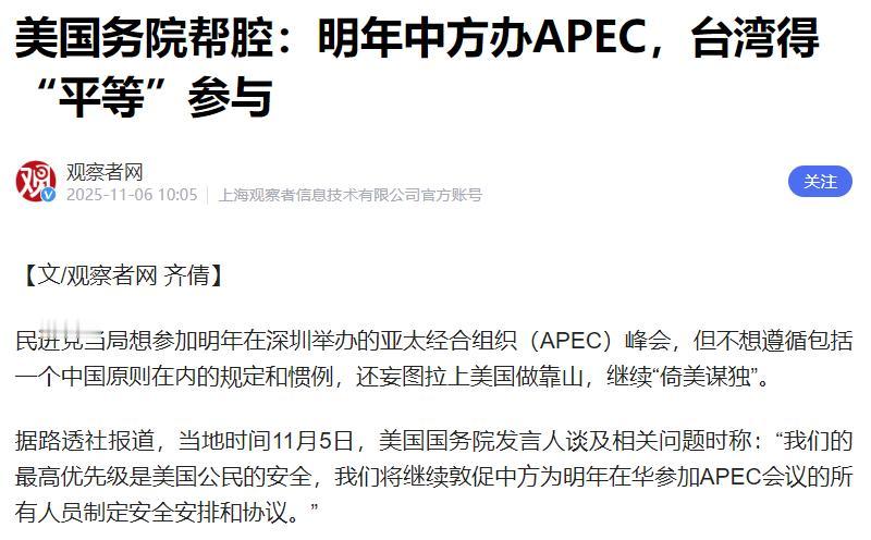 11月5号,美国国务院对外表态,强调虽然中国深圳将于明年11月举办APEC峰会,但“台湾应该享有全面且平等的参会资格”。那么如何看待美国的这个表态,明年的深圳APEC峰会,围绕台湾议题又会出现哪些交锋呢? 说白了,美国国务院这就是揣着明白装糊涂,借着APEC的由头又想打台湾牌,本质还是老一套的“以台制华”,可偏偏忘了APEC的规矩早把台湾的身份钉死了。 1991年中国、中国台北和香港加入APEC时就定好的规矩,写在谅解备忘录里明明白白:台湾只能以“中国台北”的地区经济体身份参会,“外交部长”级别的官员都没资格出席外交部长会议,更别提什么“全面且平等的参会资格”了。 美国的说法本身就违了规,他们自己之前在确认函里都写着“中国台北以地区经济体参与”,现在跳出来喊话,多少有点自打脸的意思。 回顾过去大陆两次办APEC的经历,就知道这种博弈早有先例。 2001年上海APEC,台当局想突破框架派不符合规定的人出席,结果直接没能派人参加,规矩就是这么硬。2014年北京APEC,台当局又想借着峰会搞见面会,妄图把地区事务变成国际话题,大陆直接用“西雅图模式”堵了回去——台湾地区领导人根本没入场券,只能派经贸界代表列席,所谓的“政治突破”连影子都没有。 这两次博弈早说明白了,大陆主办APEC,一个中国原则就是不可碰的红线,谁想越界都得碰壁。台当局当前只有两种选择,要么老老实实派个合规的代表参加,要么直接挑衅派个“台独”分子参加。 但其实台当局怎么选都是死路一条,今年在韩国APEC出席的林信义,本身是前行政机构次要负责人,去年就以同样身份参会,这次在韩国高调穿梭搞“私下接触”,还跟日本首相高市早苗合影炒作,可除了岛内媒体自嗨,国际社会根本没人当真。 就算明年还派他来深圳,大陆早划好了红线:代表必须是经济职能人员、不能用主权意味表述、所有互动都得备案审核,想再搞“交际花”那套根本没空间。 要是敢故意派大陆不接受的人,比如带政治职务背景的角色,那就是重蹈2001年的覆辙,直接失去参会资格,反而落个破坏经济合作的骂名,台当局这点账应该算得清。 台当局顶多在舆论上闹点小动静,想在实质层面搞突破纯属妄想。APEC21个成员里,绝大多数都承认一个中国原则,联合国大会第2758号决议也摆在那,没人愿意为了台湾省得罪中国,毕竟APEC是搞经济合作的平台,没人想被政治议题搅黄。 我国现在在APEC的话语权早不是当年,这次直接明确了三条红线,等于设了道“政治防火墙”,台代表连私下接触都得报备,想炒作议题都没机会。 美国虽然还要帮腔,但也就是口头喊喊,去年蔡英文窜美,美国官网还标着“中华台北”,今年台湾申请加入CPTPP,美国连联署都不敢,真到深圳峰会,未必有人愿意跟着美国蹚浑水。 台当局心里的小九九其实很清楚,无非是想借着APEC扩大所谓“国际能见度”,搞“渐进式台独”,可这套在大陆主办的峰会上根本玩不转。 从1992年备忘录签署到现在,三十多年了,台湾参会的框架就没变过,发言得排在“中国”之后,不能签有法律约束力的文件,这些“地区经济体”的标配从来没改。 两岸统一是历史大势,对侵权挑衅有充分实力应对,美国都得谨言慎行,台当局还想靠外人撑腰搞动作,纯属白费力气。 明年深圳峰会上,这场博弈最终只会再次证明,台湾的参会资格从来由不得美国指手画脚,更由不得台当局讨价还价,祖国统一的底线,谁也碰不了。