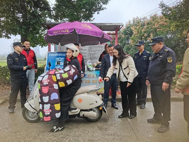 在一劝导站附近,“交通劝导员”为过往“五小车辆”粘贴反光提示标识、标注“安全驾驶严禁载人”警示语,向路过的电动车骑行人员宣传不超员超载、不逆行不抢道、不酒驾醉驾、开车不看手机、不疲劳驾驶、雨天减速慢行、注意盲区等,做到安全出行;向不配戴头盔的电动车车主发放宣传单、面对面宣讲骑行配戴头盔的重要性和必要性。同时还为24个劝导站的72名交通劝导员送上交警小熊、交通安全抱枕等,以表慰问。