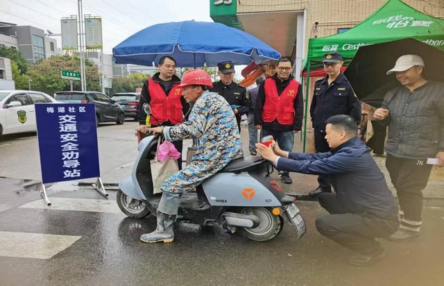 在梅湖社区,社区劝导站交通劝导员为出行居民的电动车贴上反光标识。