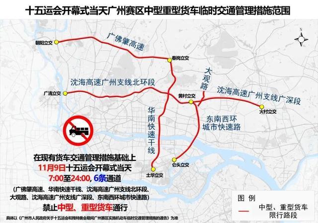 十五运会开幕式(11月9日)当天,在现有市区货车限行措施基础上,增加7时至24时禁止中型、重型货车通行广佛肇高速、华南快速干线、沈海高速广州支线北环段、大观路、沈海高速广州支线广深段、东南西环城市快速路的临时管理措施。