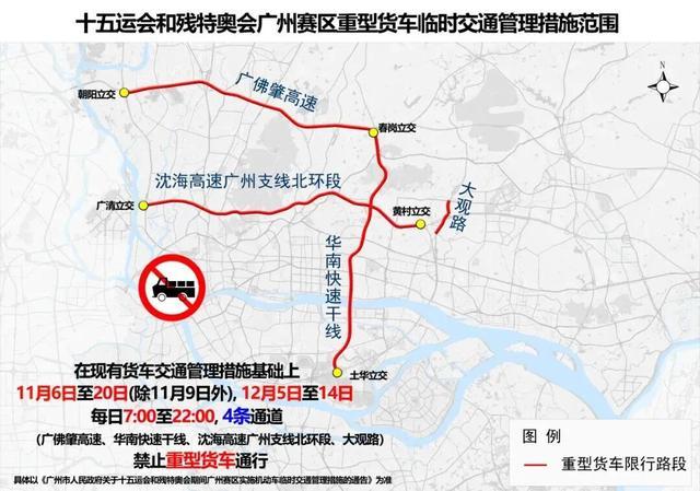 十五运会和残特奥会期间(除11月9日外),在现有市区货车限行措施基础上,增加每日7时至22时禁止重型货车通行广佛肇高速、华南快速干线、沈海高速广州支线北环段、大观路的临时管理措施。