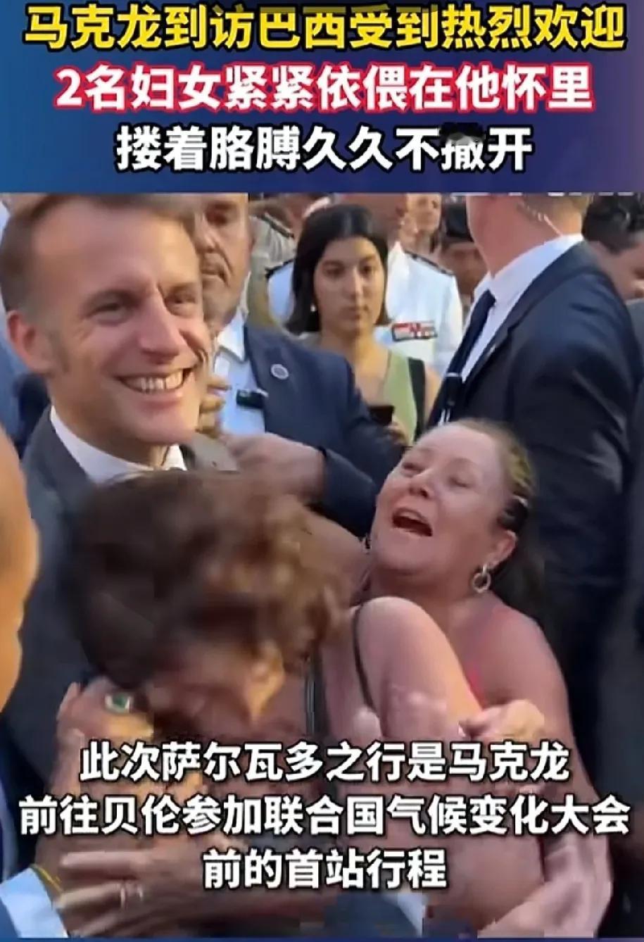 马克龙访问巴西,受到了巴西人民的热烈欢迎,这俩妇女更欢迎他。俩个小仙女,争先恐后的要跟他拥抱。搂着马克龙的胳膊都不愿意放手,看把马克龙高兴的合不拢嘴。 这次马克龙的夫人朱丽吉特,没有同行。又少了一道美丽的风景。