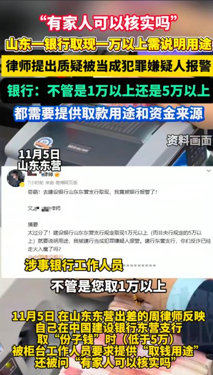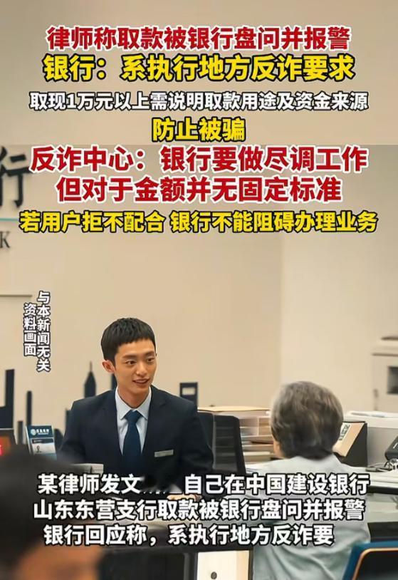 周律师这是和银行杠上了,为了给朋友结婚赶礼,竟然被银行工作人员报帽子叔叔。 这个取款用途如何证明,如果我是随礼,是不是要叫亲友写证明,如果我是要买家私,是不是要叫家私厂开证明,如果用来超市消费,要叫超市开证明吗?从银行转走诈骗的钱一个追不回来,倒是把老百姓的钱袋子看的挺紧的! 到银行取现金,银行问用途完全是多此一举,如果是在卡上转账,你多问几句还说得过去,难道从银行取了现金,在银行门口交给诈骗分子吗? 银行默认每个储户都是罪犯,让储户自证清白,自证自己的存款是正常所得,是正常花费,真是笑话!