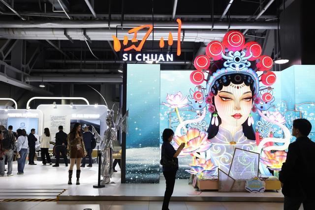 这是古今交融的四川展厅,川剧脸谱的新潮表达颇为吸睛。展陈尽显天府之国的丰饶和成都当下取得的发展成就。