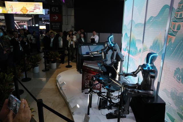 浙江展厅门口,杭州本土科创企业的人形机器人组成乐队奏乐,欢迎四海宾朋。