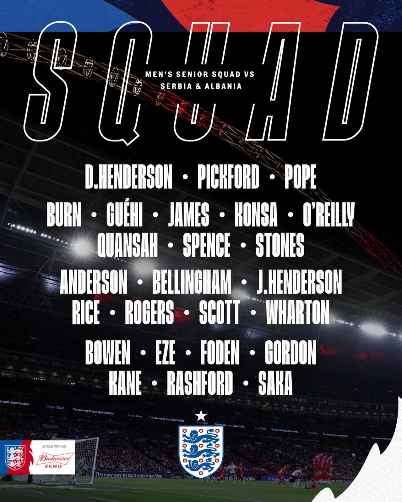 英格兰大名单:凯恩、拉什福德领衔,福登、贝林厄姆回归