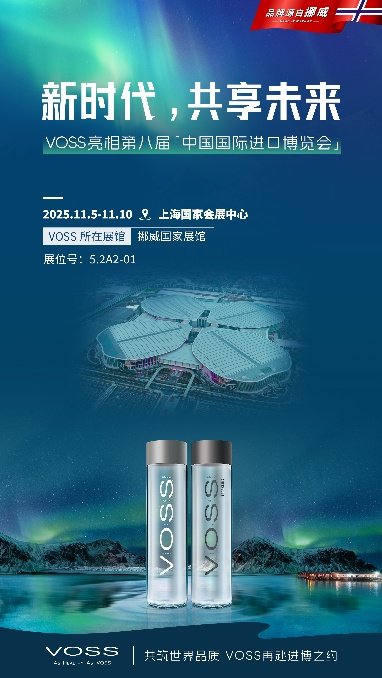 第八届中国国际进口博览会于2025年11月5日至10日在国家会展中心(上海)盛大启幕。受挪威驻上海总领事馆特别邀请,源自挪威并深耕中国市场多年的高品质饮用水品牌VOSS再度亮相挪威国家馆,继去年首秀后连续两年成为代表品牌之一。借助进博会这一世界级开放平台,VOSS以“水”为媒,传递挪威的纯粹精神与精致生活方式的共鸣。