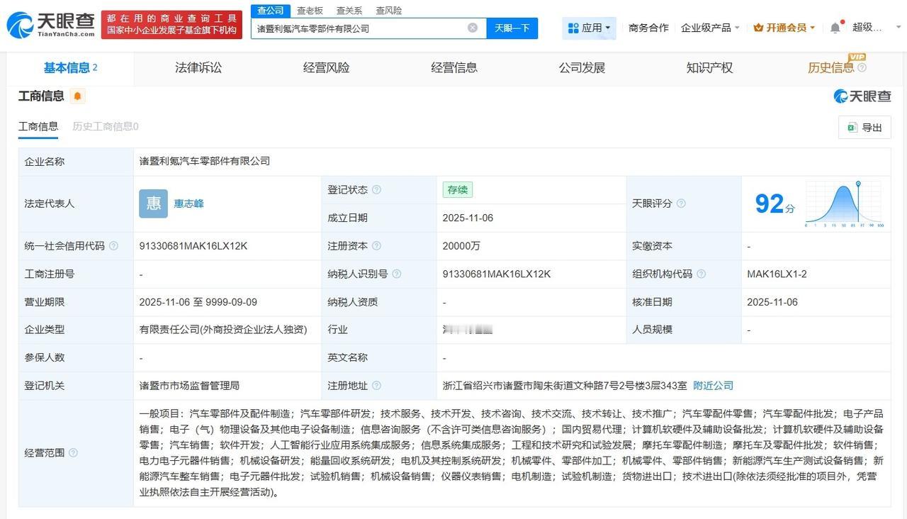 利氪科技在诸暨成立汽车零部件公司注册资本2亿 天眼查App显示,近日,诸暨利氪汽车零部件有限公司成立,法定代表人为惠志峰,注册资本2亿,经营范围包括汽车零部件及配件制造、汽车零部件研发、汽车零配件零售等。股东信息显示,该公司由利氪(浙江)科技有限公司全资持股。 天眼查信息: