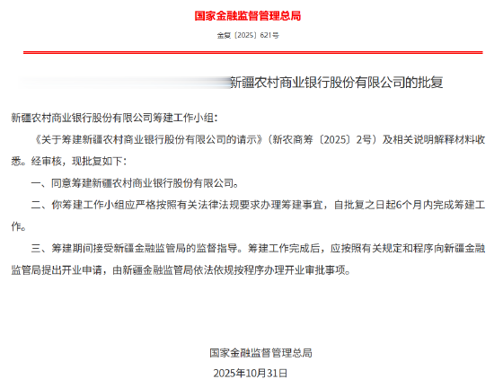 11月7日金融一线消息,国家金融监督管理总局发布批复,同意筹建新疆农村商业银行股份有限公司。国家金融监督管理总局要求,新疆农村商业银行筹建工作小组应严格按照有关法律法规要求办理筹建事宜,自批复之日起6个月内完成筹建工作。筹建期间接受新疆金融监管局的监督指导。筹建工作完成后,应按照有关规定和程序向新疆金融监管局提出开业申请,由新疆金融监管局依法依规按程序办理开业审批事项。