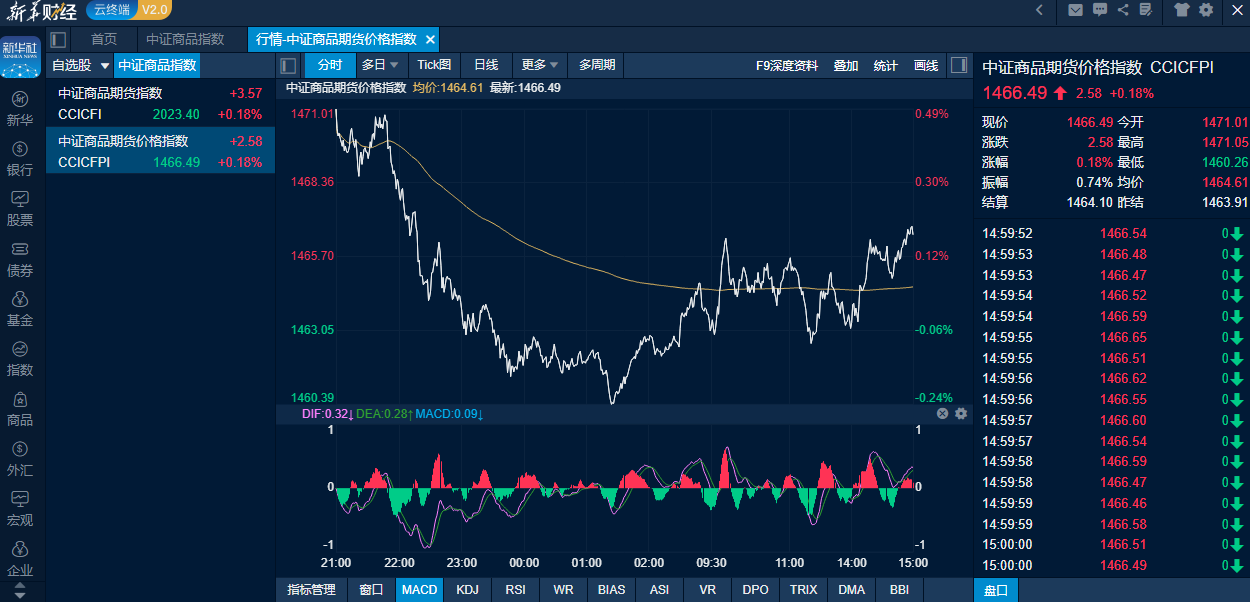新华财经北京11月7日电(吴郑思、张瑶)国内商品期货市场周五(11月7日)整体震荡偏弱,品种强弱分化明显。截至收盘时,综合衡量市场走势的中证商品期货价格指数收报1466.49点,较前一交易日上涨2.58点,涨幅0.18%;中证商品期货指数收报2023.40点,较前一交易日上涨3.57点,涨幅0.18%。