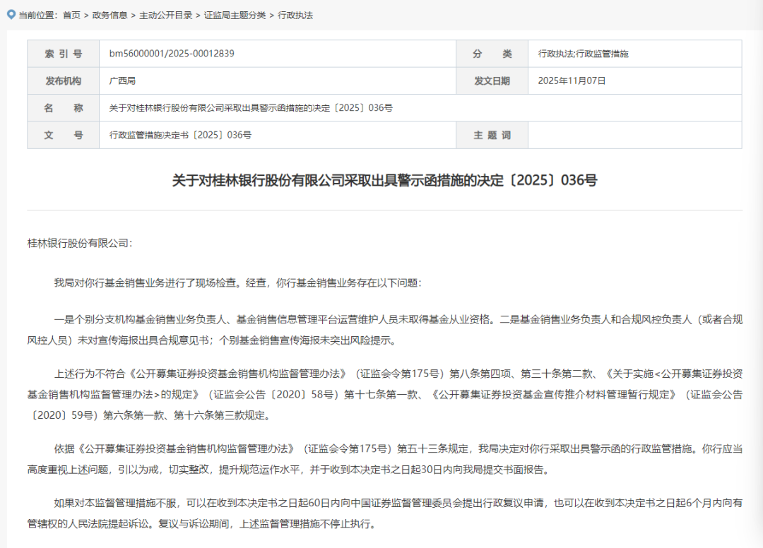 11月7日,桂林银行因存在多项基金销售业务违规,收到广西证监局开具的警示函。
