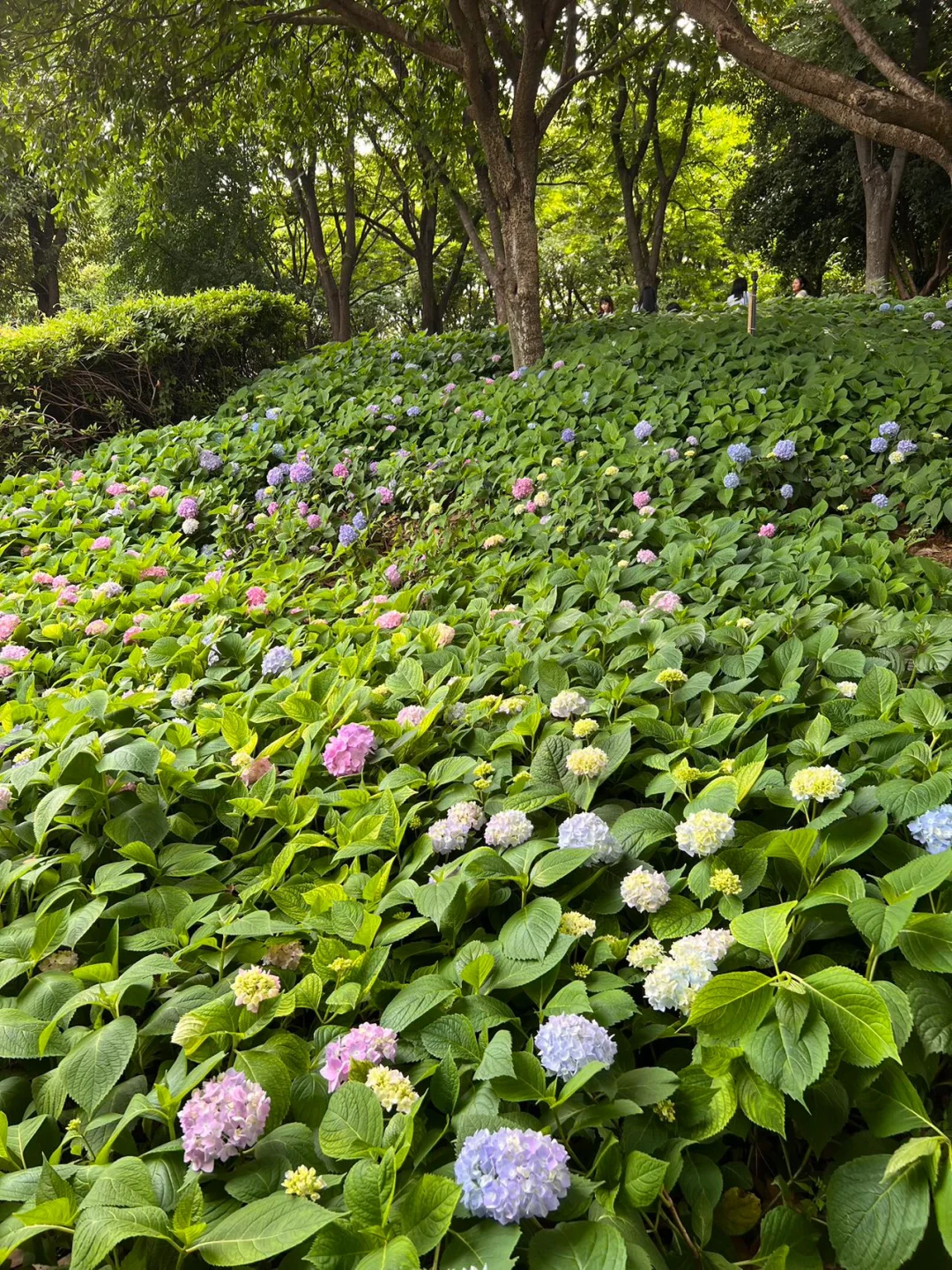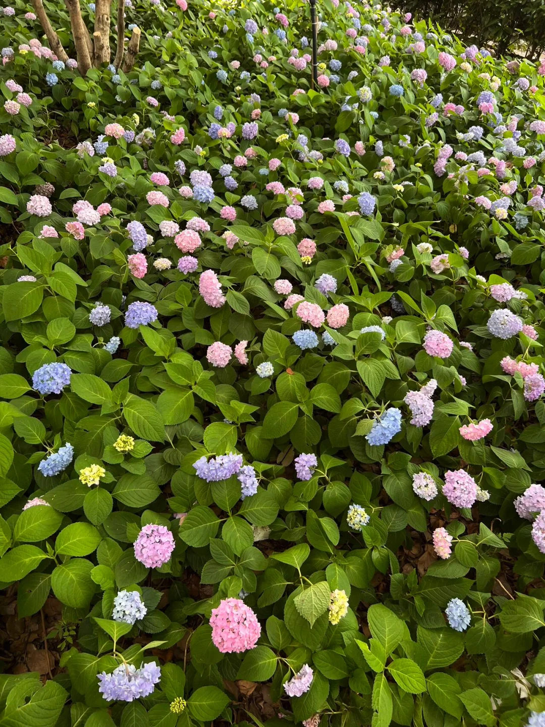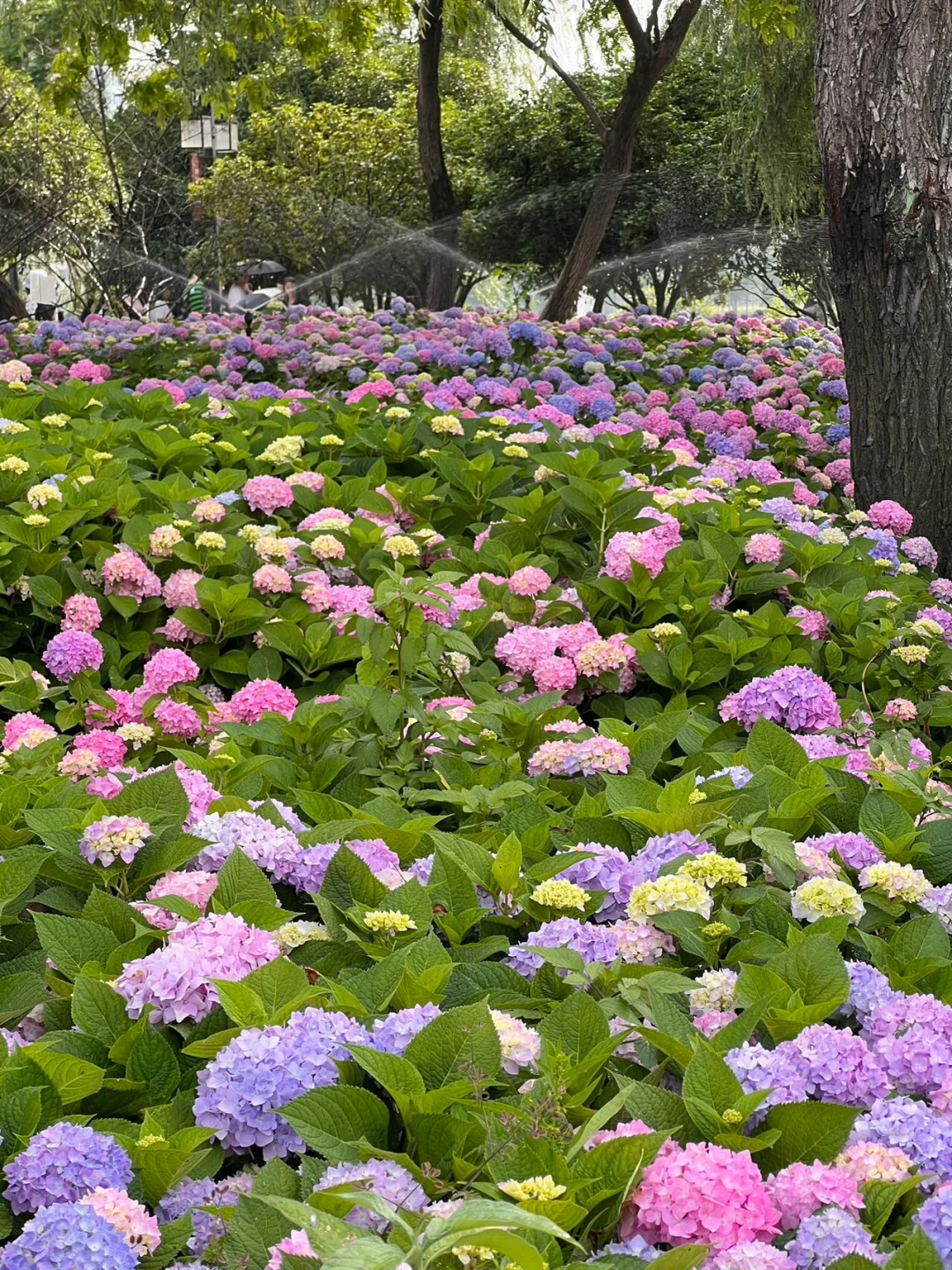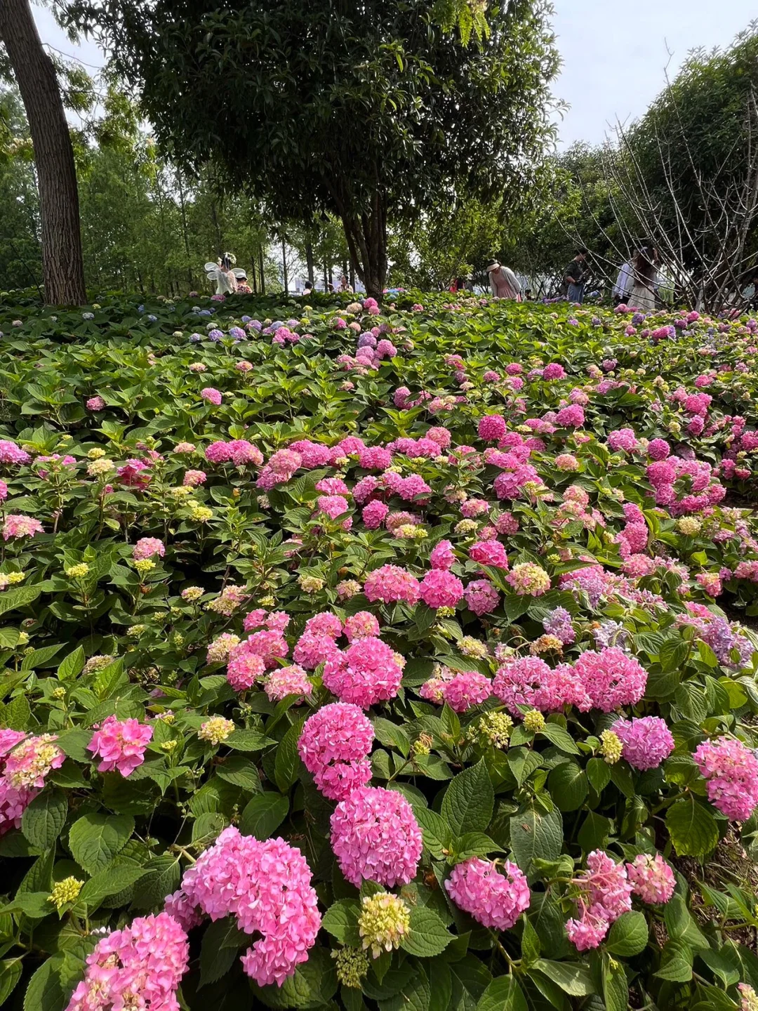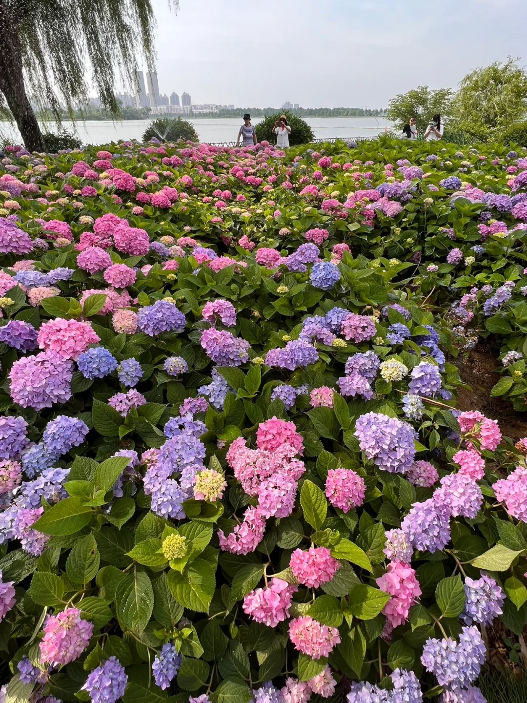 是武汉的公园中绣球种植面积较大的,3200平方米,七万株绣球锦绣金银湖畔,一朵朵绣球花彼此簇拥着盛放,粉蓝相间,梦幻又浪漫