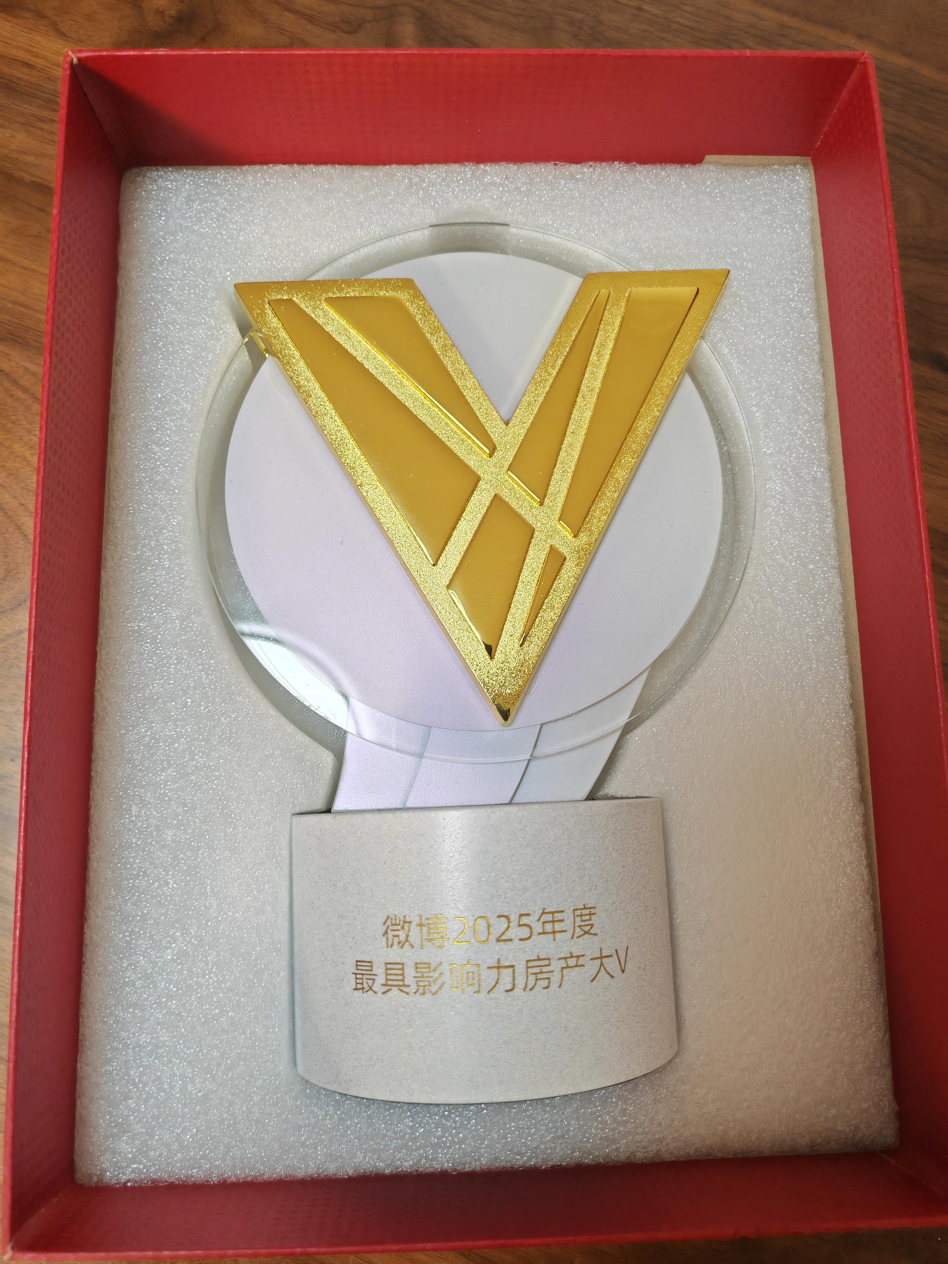 刚收到寄来的奖杯,非常感谢!我已经获得5届微博最具影响力房产大V,感谢所有关注我