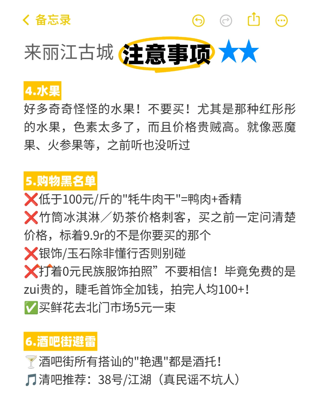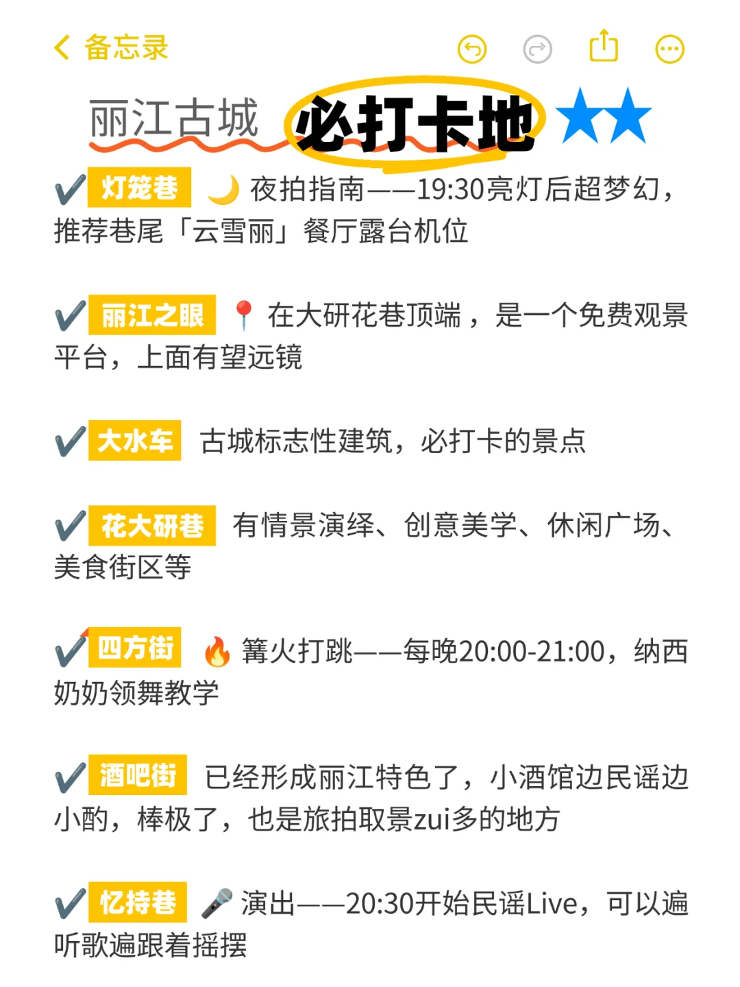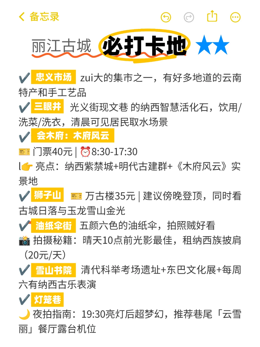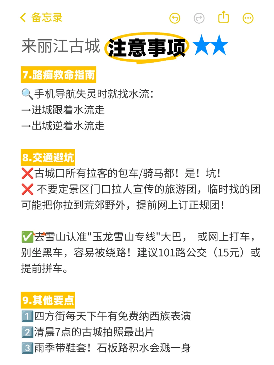 ❤️交通:\n✈️飞机:飞到丽江三义机场\u00a0,然后坐机场大巴经过丽江古城,40min/班,20r/人\n🚃景区直通车:在vx小🍊xu中🔍“丽江旅游直通车”,每人10r/人\n—\n🚶🏻\u200d♂️一日游览路线:\n南门→南门桥→雪山书院→万子桥→普贤寺→灯笼巷→丽江之眼→大研花巷→大水车→酒吧街→忆持巷→四方街→纸伞巷→木府→狮子山→三眼井→古城忠义→南门\n—\n✨门票省钱tips\n✅带学生证/军官证!木府40r等景点门票半价or免费\n✅木府必打卡!《木府风云》取景地🕘9:00-18:00开放\n—\n👗穿搭预警\n⚠️早晚温差巨大!包里塞件厚外套\n📸拍照首选复古长裙+民族风披肩+平底靴\n(披肩逛街时记得收起来!本地人识别器实锤)\n—\n🚖住宿血泪经验\n💣古城石板路+迷宫导航=拖行李噩梦\n💡订房前问清能否电动车接送!\n🌙酒吧街附近民宿慎选!凌晨三点还在唱歌\n—\n🚫避雷专区\n❌水果刺客警告!恶魔果火参果达咩\n❌酒吧艳遇?酒托演技比刘烨还好\n❌门口黑车别信!骑马包车认准正规渠道\n❌牦牛肉干价格<100r/斤的绝对假货\n💡zui后说一句:古城里所有主动搭讪的\"好心人\"都要警惕!!\n—\n❤️美食推荐:\n✔️田村石锅鸡(丽江古城店)\n这个石锅鸡我好爱,鲜到掉毛的鸡汤让人欲罢不能,每块鸡肉滑嫩多汁,双重buff叠满,下次还来这家吃\n古城内的云南小粒咖啡、烤乳扇、米线、腊排骨等都是值得的美味\n丽江\u00a0云南旅游\u00a0旅游攻略令人难忘的景点最美的古镇丽江古城云南丽江美食丽江旅游攻略先出发再说