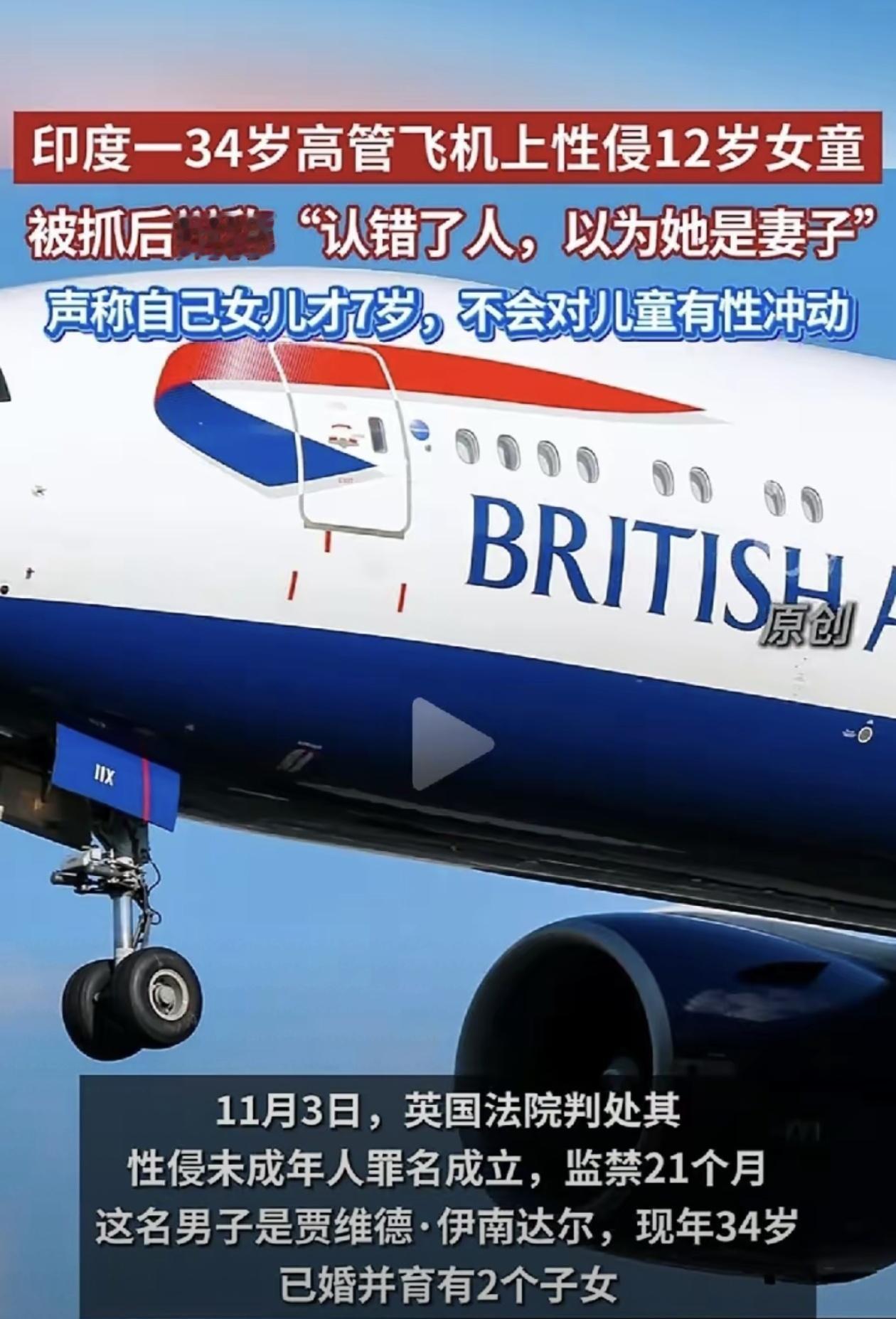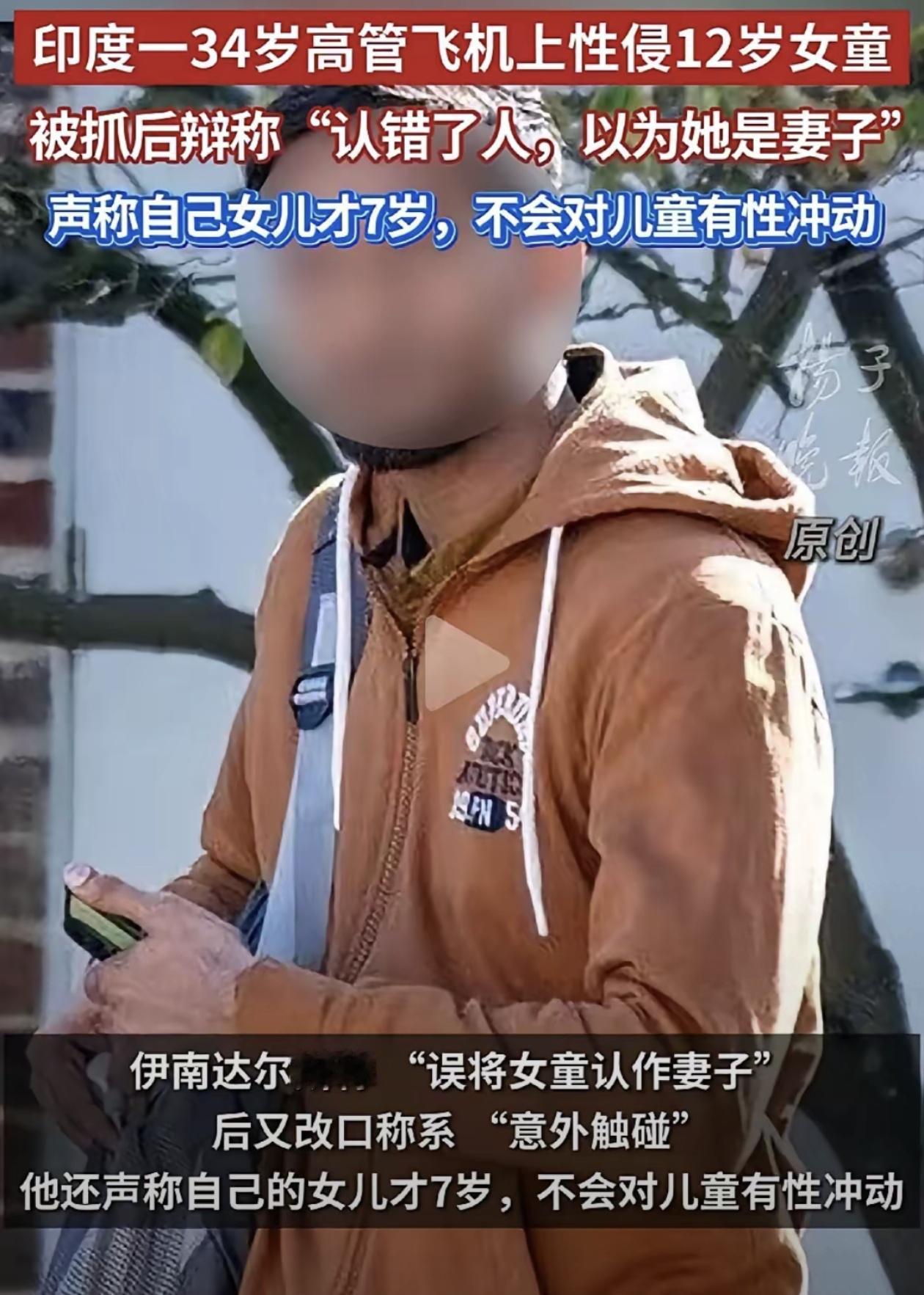 印度男子飞机上性侵12岁女孩! 这个事听起来太离谱了,这个阿三34岁,是个企业高管。当他看到邻座女孩熟睡中,是一个12岁的小女孩,便精虫上头下手了,他先是摸手试探,接着就触碰私密部位。被抓之后居然这样辩解:我认错人了,以为她是我老婆。为了进一步证明自己没有侵犯女孩,继续说:我自己的女儿才7岁,我怎么会对儿童有性冲动? 听起来是不是很气?这是什么逻辑?认错人?老婆和12岁女孩的外貌、身形能一样吗?你有7岁女儿,就能证明自己不会伤害其他孩子?这哪里是在辩解,是把所有人的智商按在地上摩擦! 这个12岁的孩子,在熟睡中被侵犯。本应该是安全的航班,却成了她和家人的噩梦。我都在想,空姐在干什么?孩子的家人在干什么?前些天还看到高铁上,女儿和妈妈两个人购买的座位因为不在同一排,坐在女儿旁边的男子便对女孩动手动脚,不光手摸,甚至上嘴亲女孩,女孩的妈妈发现冲上前,那个坏货还狡辩,说是觉得女孩可爱,并没有其他想法。关键你又不是孩子的家人和熟人啊,高铁乘警将男子以涉嫌猥亵女童拷走。 在飞机上这个事,好在英国法院没惯着他,11月3日已判他性侵未成年人罪名成立,监禁21个月。但这事儿更该让人警醒:有些恶,和身份、职业无关。有些借口,再冠冕堂皇,也盖不住骨子里的龌龊。 保护孩子从来不是一句空话,对伤害孩子的人,就该让它们付出代价!