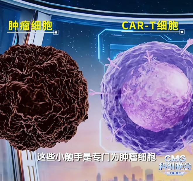 我们在实际治疗的时候,先给患者采血,血液里面就有很多这样的t细胞。通过体外的改造,让它把这些小触手都装上,然后进行扩增后,再输回给患者。患者的身体当中就有那么多的“特种兵”,它就能够强有力的来杀伤我们的敌人,对肿瘤进行精准的清除。