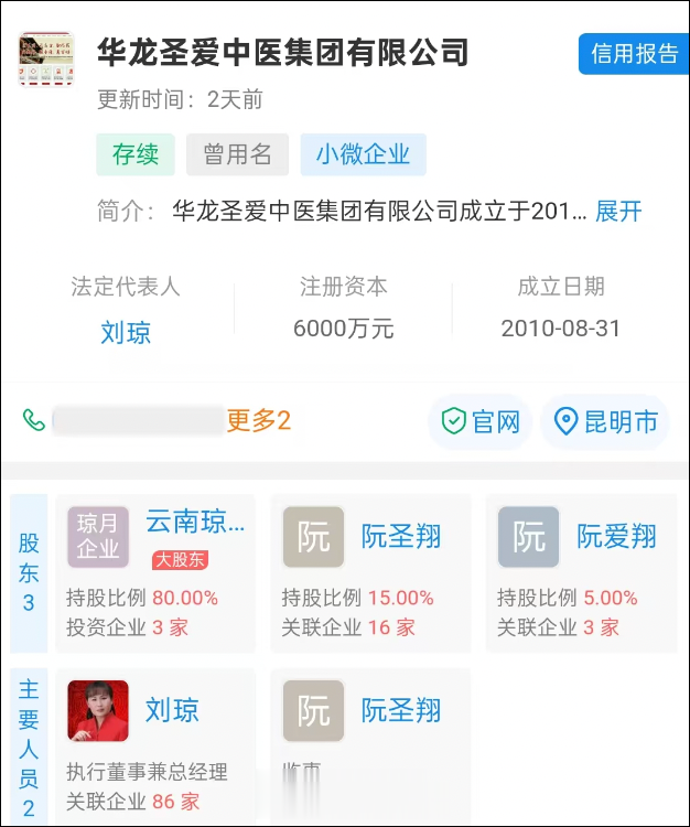 爱企查App显示,圣爱中医集团由刘琼旗下云南琼月控股,阮圣翔、阮爱翔分别持有圣爱中医集团15%、5%的股权。