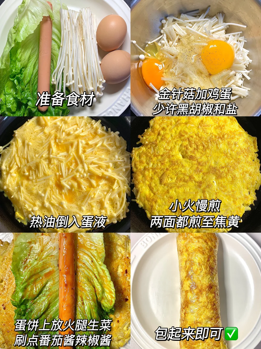 大数据请推给所有减脂期 的家人们~~来试试这个营养均衡的蔬菜卷❗️好吃又高饱腹,十分钟搞定✅做好直接装袋揣包里带走[害羞R]简单又美味! [彩虹R]食材:金针菇、鸡蛋、火腿、生菜 [种草R]做法步骤如图所示~
