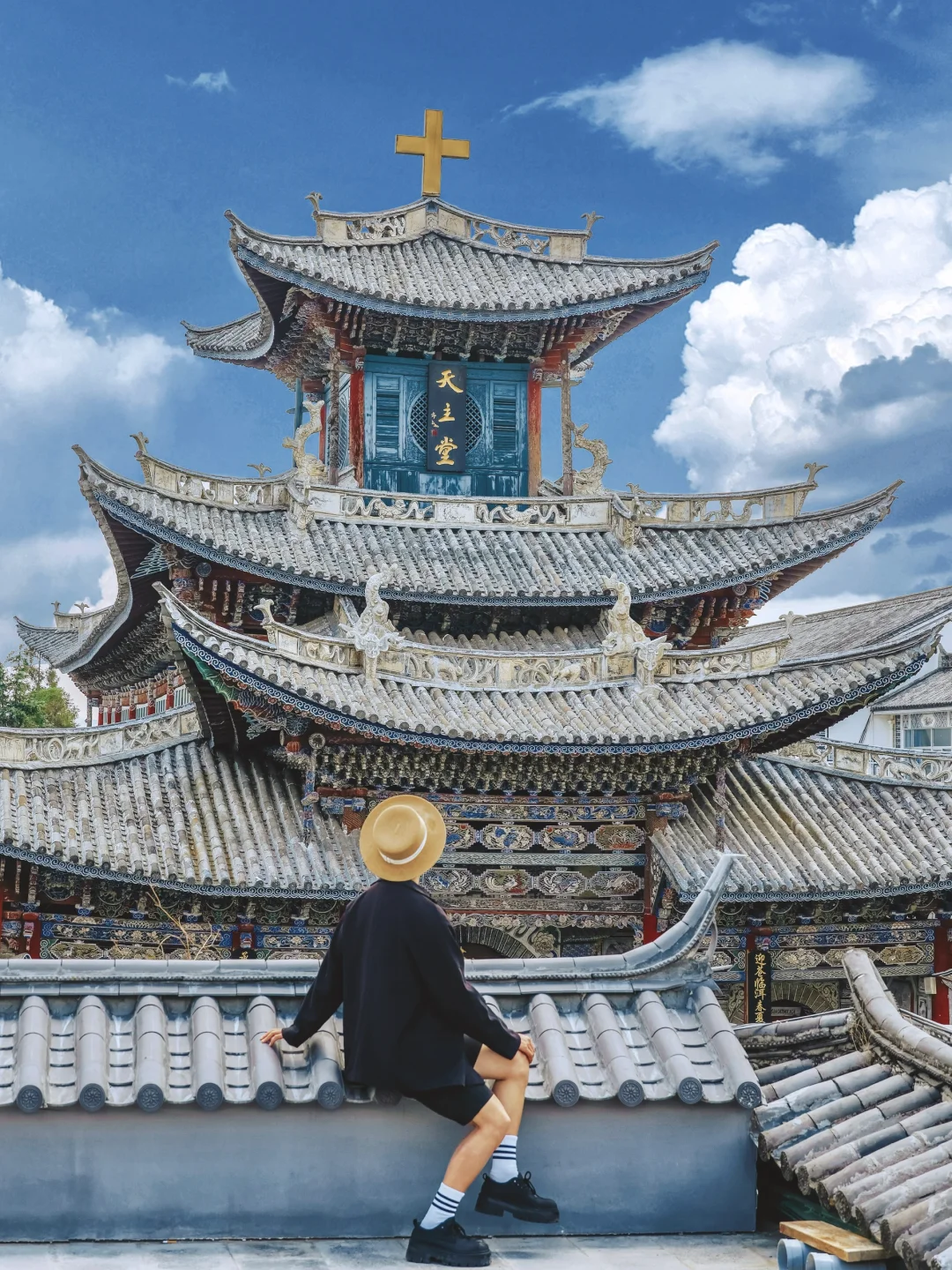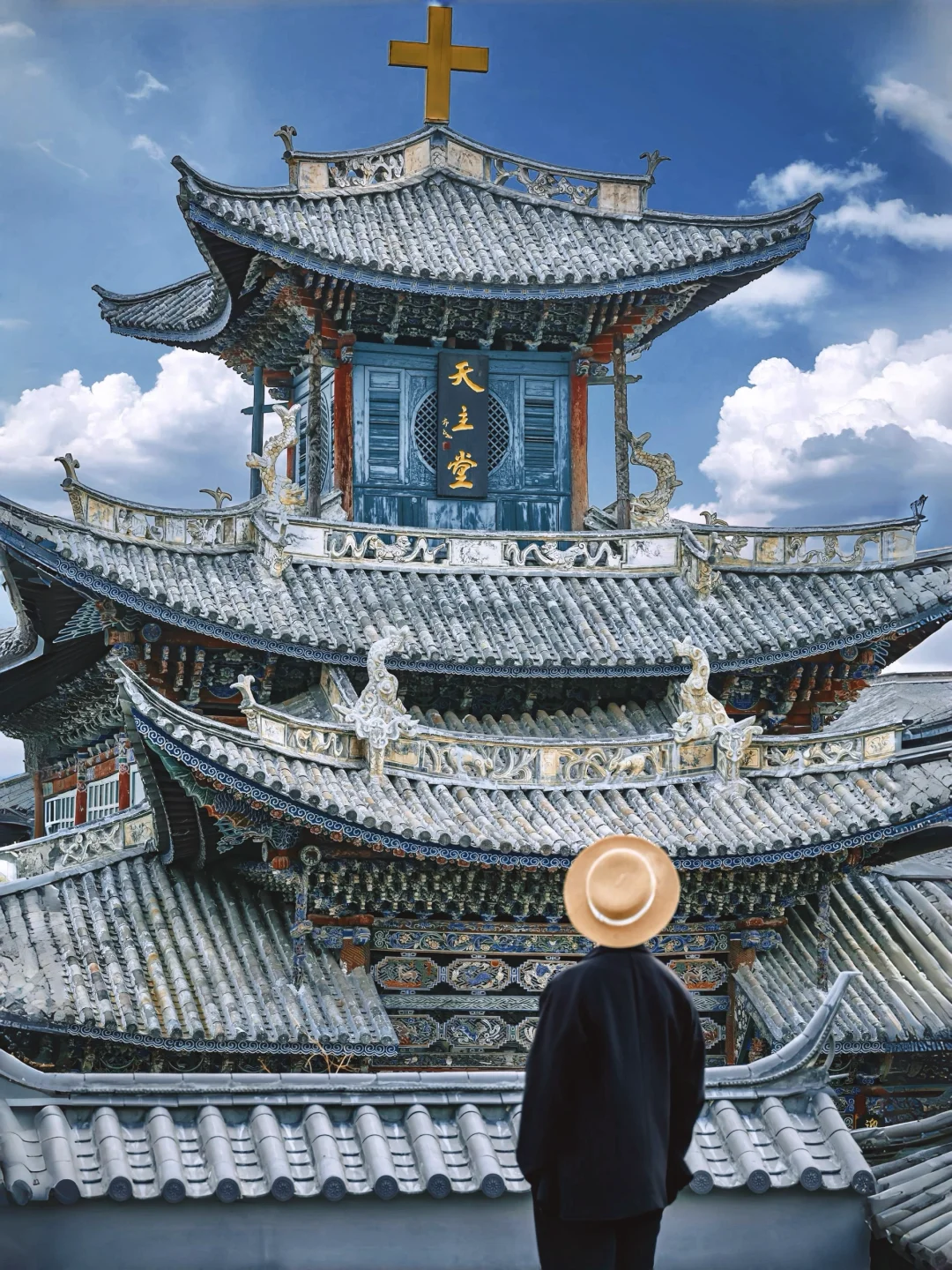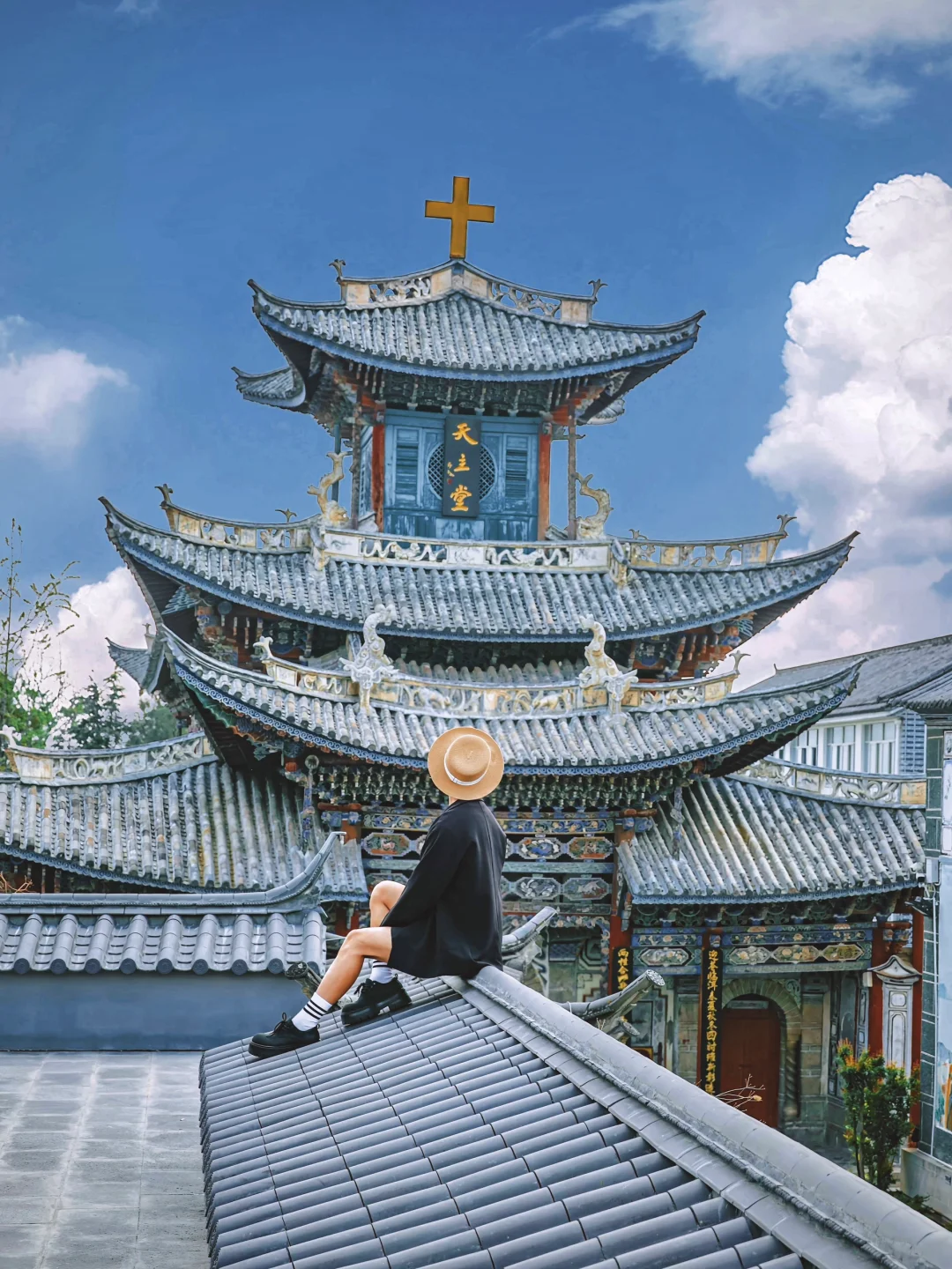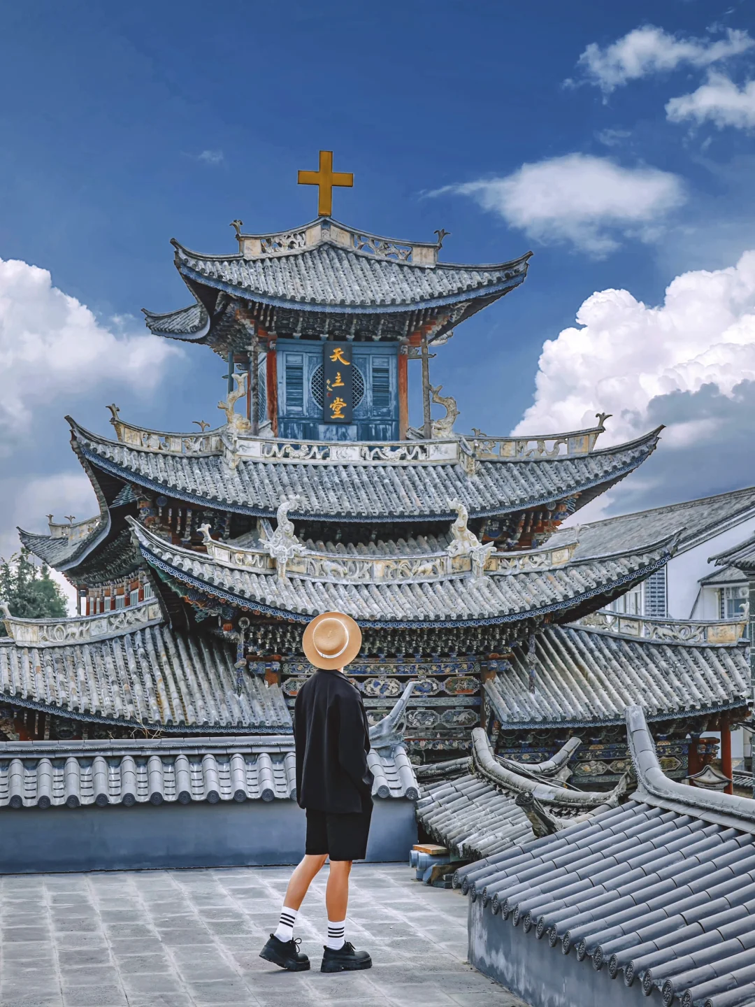 ✨ 机位亮点:爬上木质阁楼露台,白族雕花屋檐与天主教堂的“三滴水”穹顶同框!教堂蓝白彩绘的飞檐在阳光下像童话城堡,傍晚还能拍到教堂尖顶与粉色晚霞的渐变光晕~
