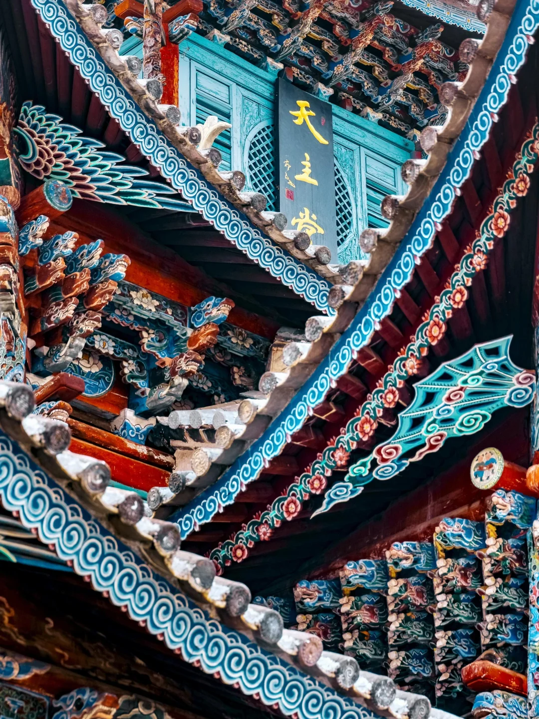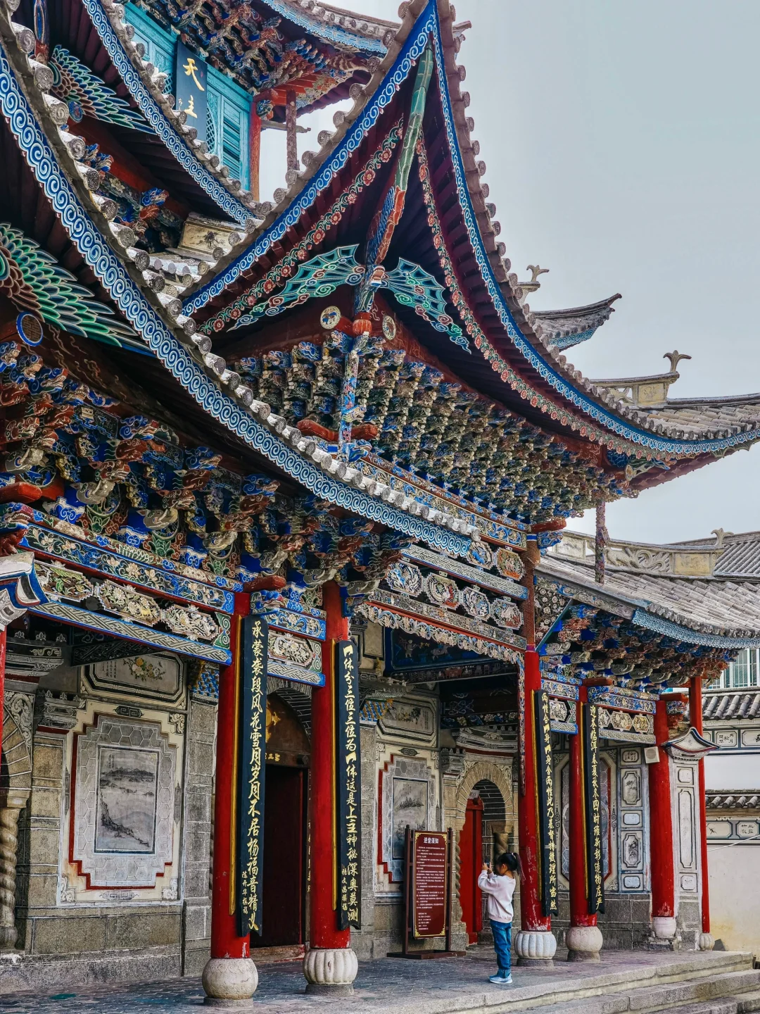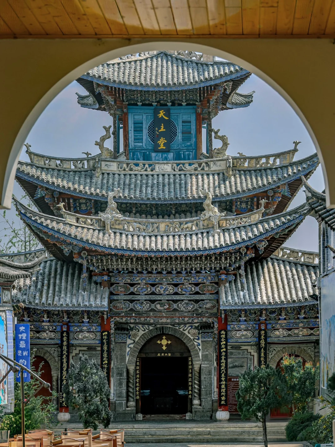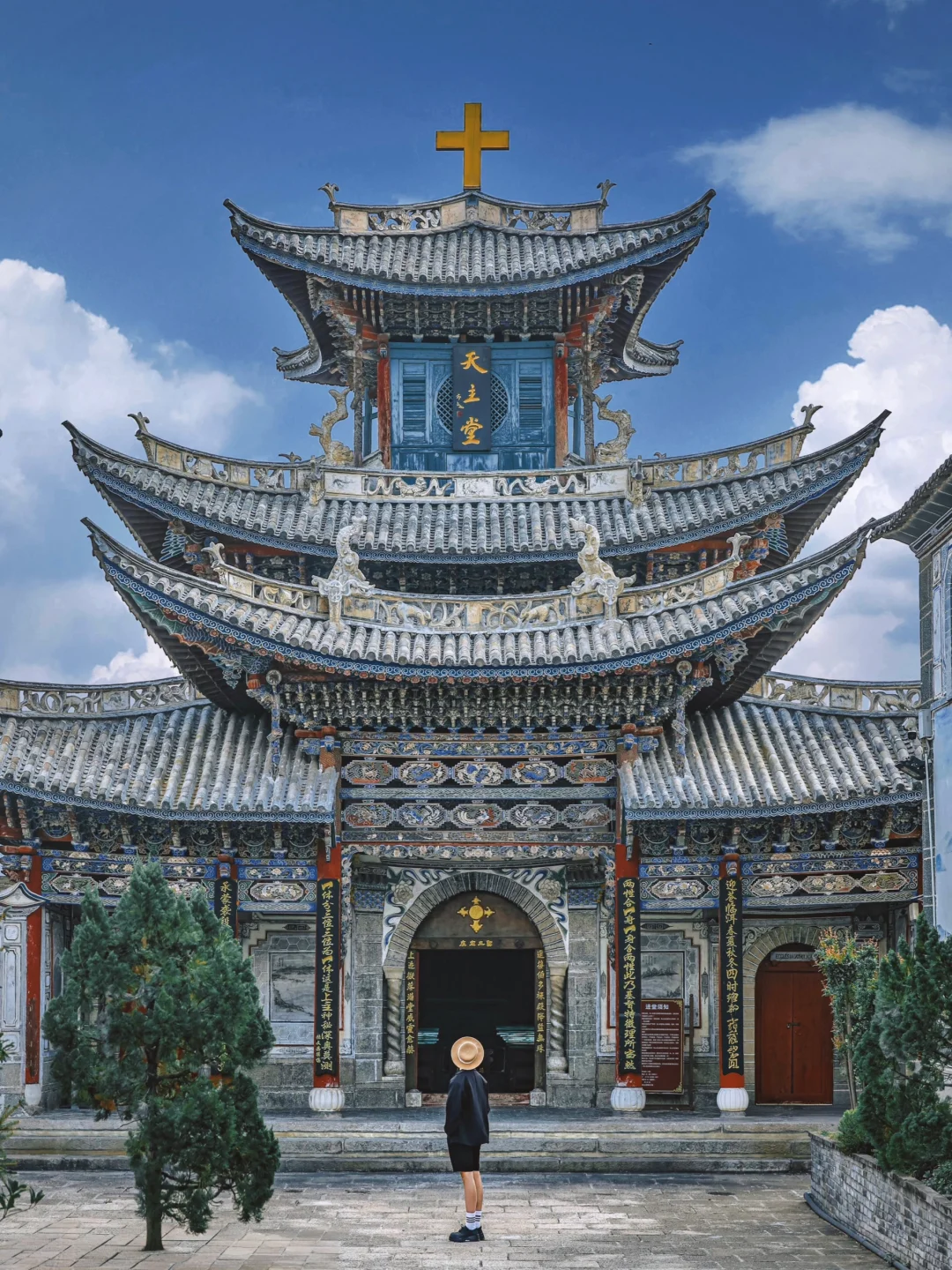 ✨ 机位亮点:爬上木质阁楼露台,白族雕花屋檐与天主教堂的“三滴水”穹顶同框!教堂蓝白彩绘的飞檐在阳光下像童话城堡,傍晚还能拍到教堂尖顶与粉色晚霞的渐变光晕~