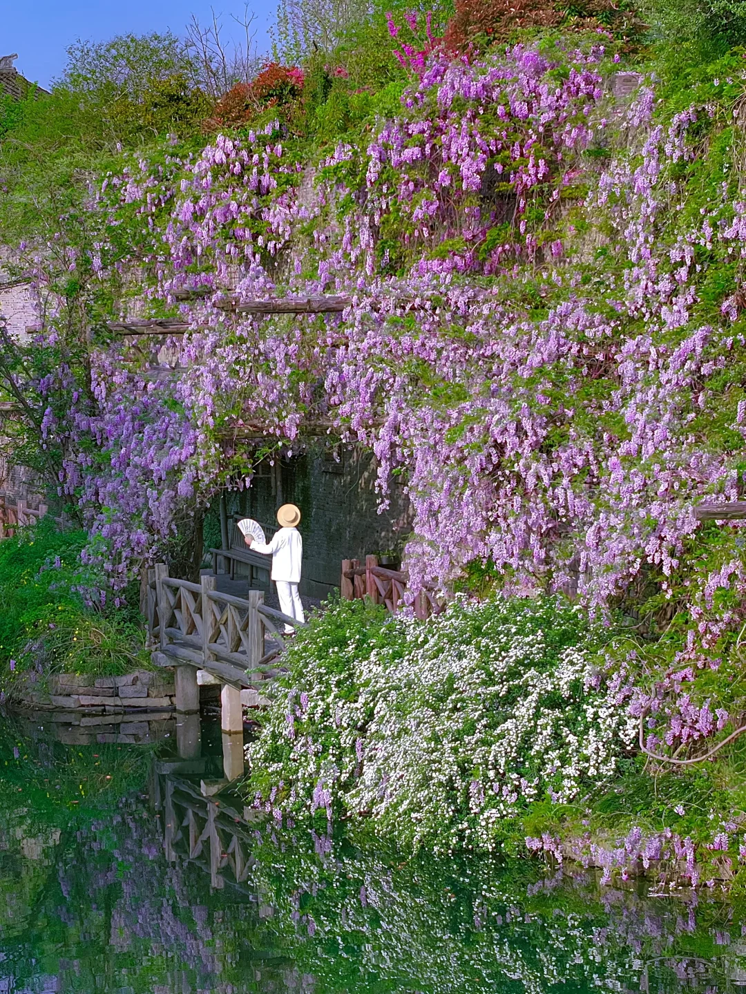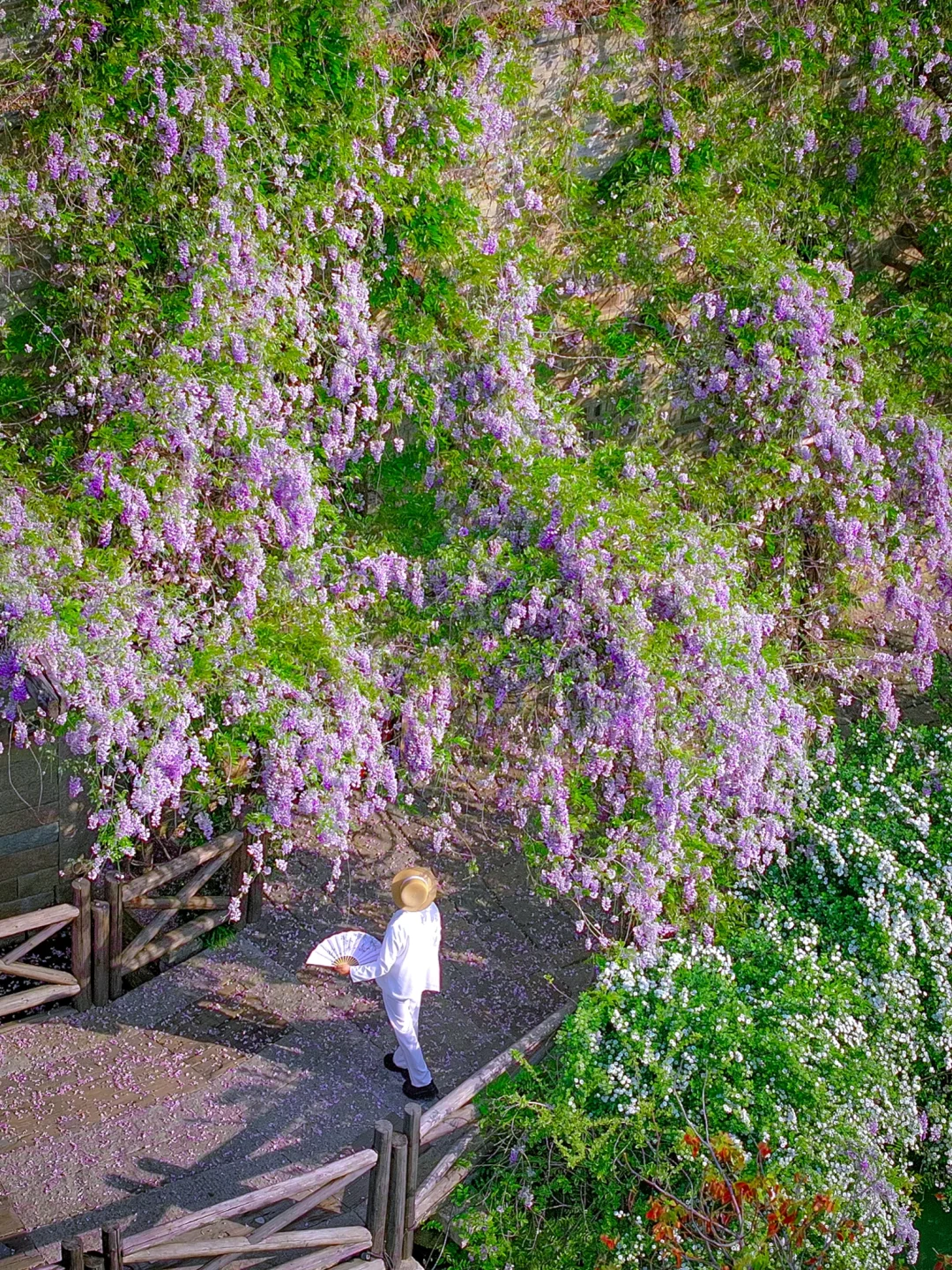 2️⃣百丈长廊紫藤瀑:游客中心沿河走!4月顶流花海,低机位仰拍“被紫藤淹没”💜