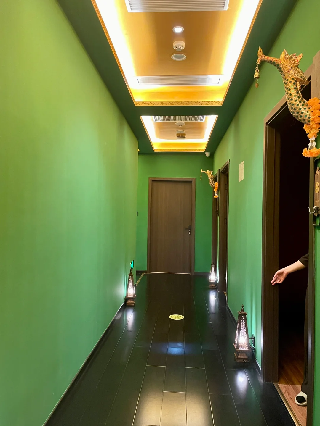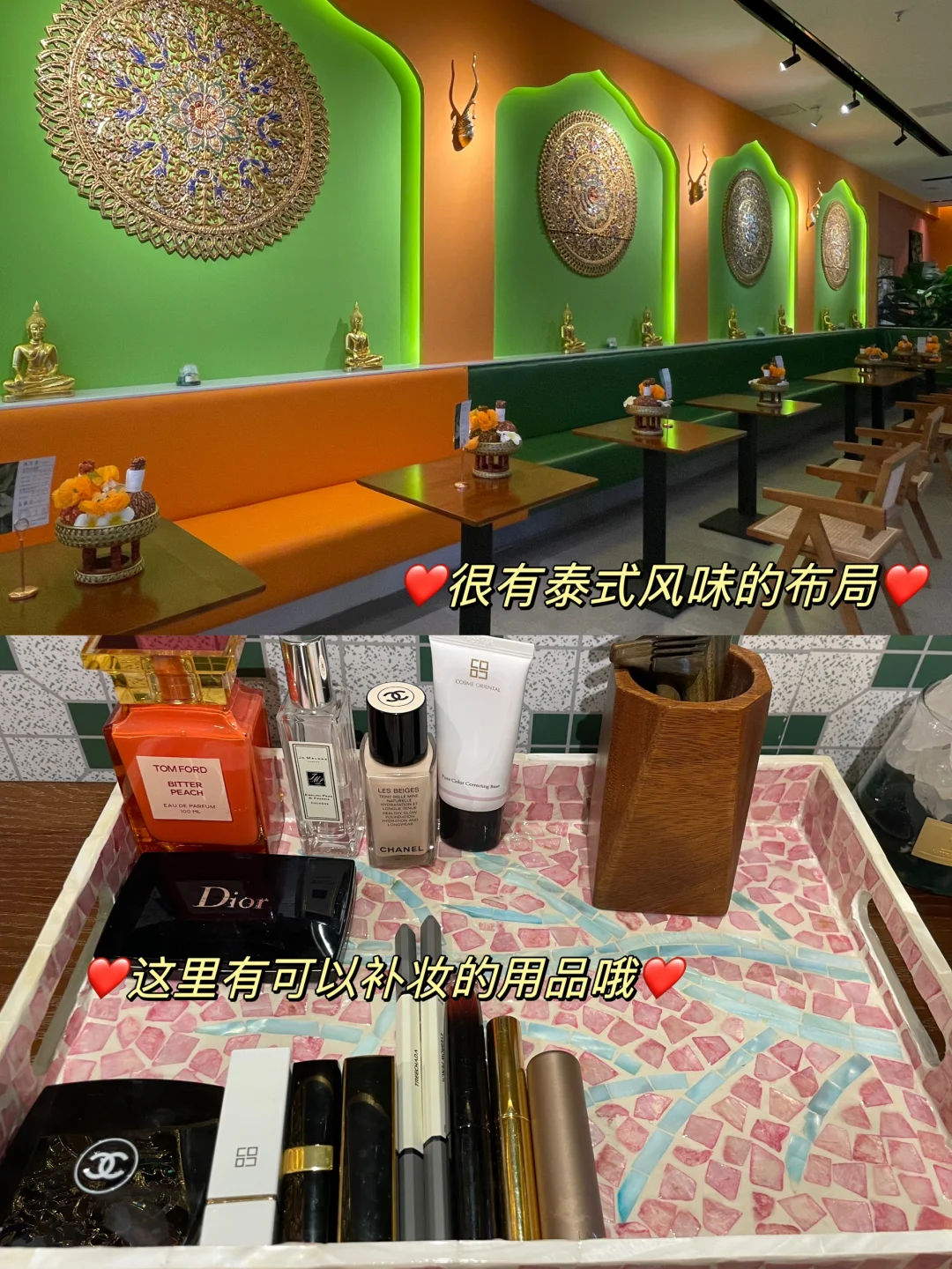 就是很泰式的氛围,整体的装修非常有特色,非常有异域风情。😇一进店门,浓厚的泰式热情直接拉满,在前台小姐姐小哥哥的引导下,先在休息区坐下,就会有准备好的香茅茶奉上,店内充满泰式风情的墙壁,精美的🖼️装饰画。还有一个专门可以补妆的化妆台,真的很赞,全是大品牌。