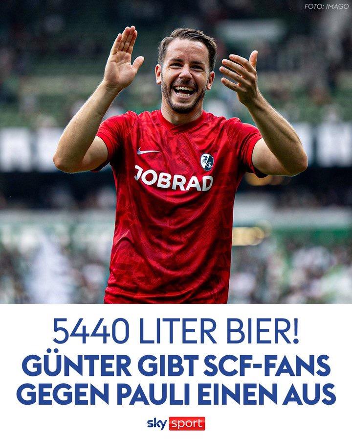 据德国天空体育消息,为庆祝这一意义非凡的时刻,这位弗赖堡队长决定以一种特别的方式感谢球迷的支持,他将在球队即将到来的主场对阵圣保利的比赛中,请球迷畅饮5440升啤酒!
