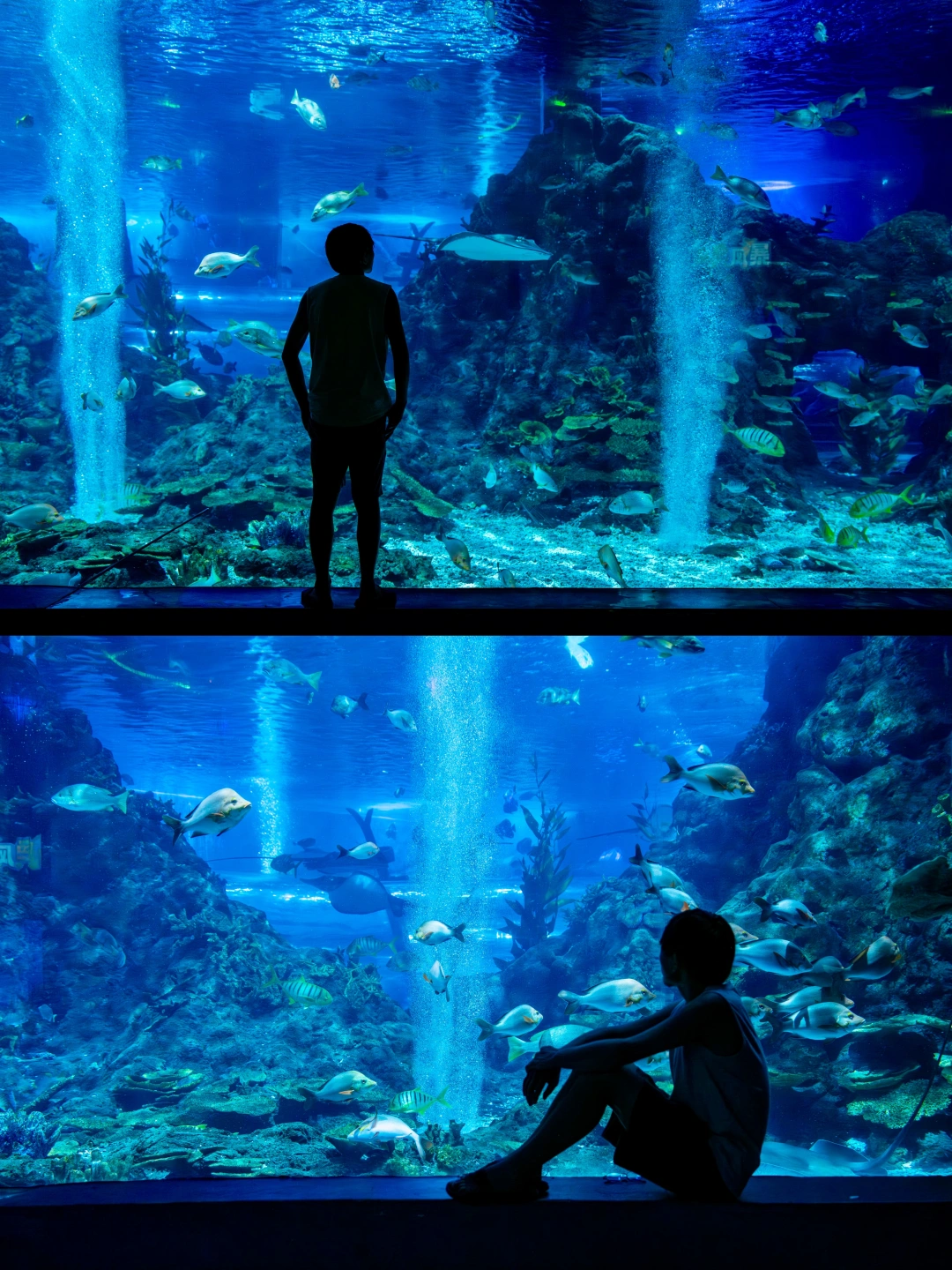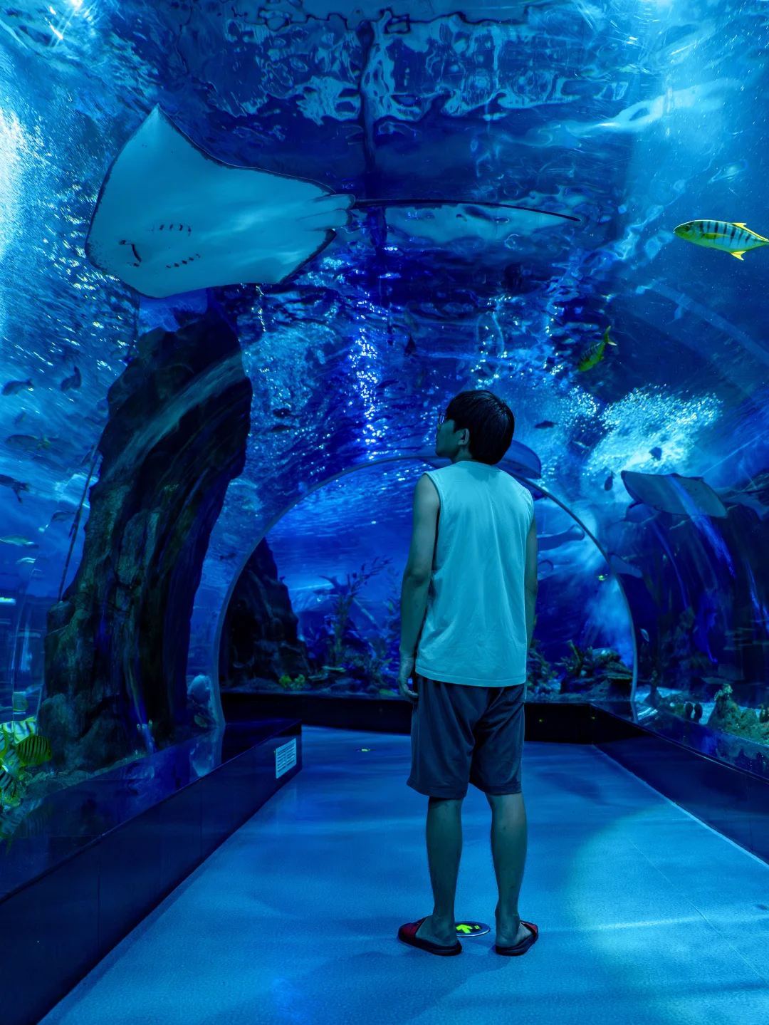 一定要去一楼海底隧道和魔鬼鱼合影,去三楼拍发光水母,里面还有海狮、海豚表演