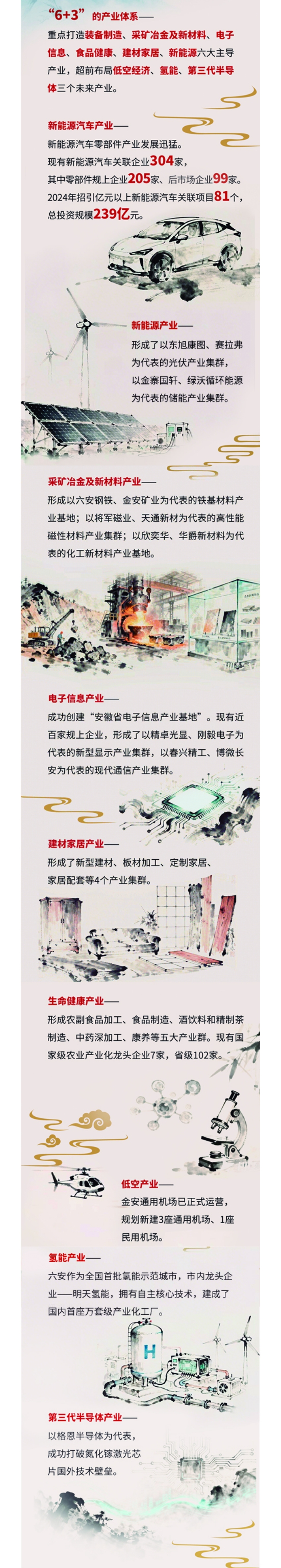 传统产业改造升级、战略性新兴产业培育壮大、未来产业超前布局。聚焦重点领域,六安因势利导,重点打造装备制造、采矿冶金及新材料、电子信息、食品健康、建材家居、新能源等六大主导产业,超前布局低空经济、氢能、第三代半导体等未来产业,形成“6+3”的产业体系。