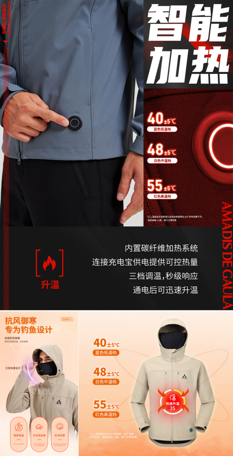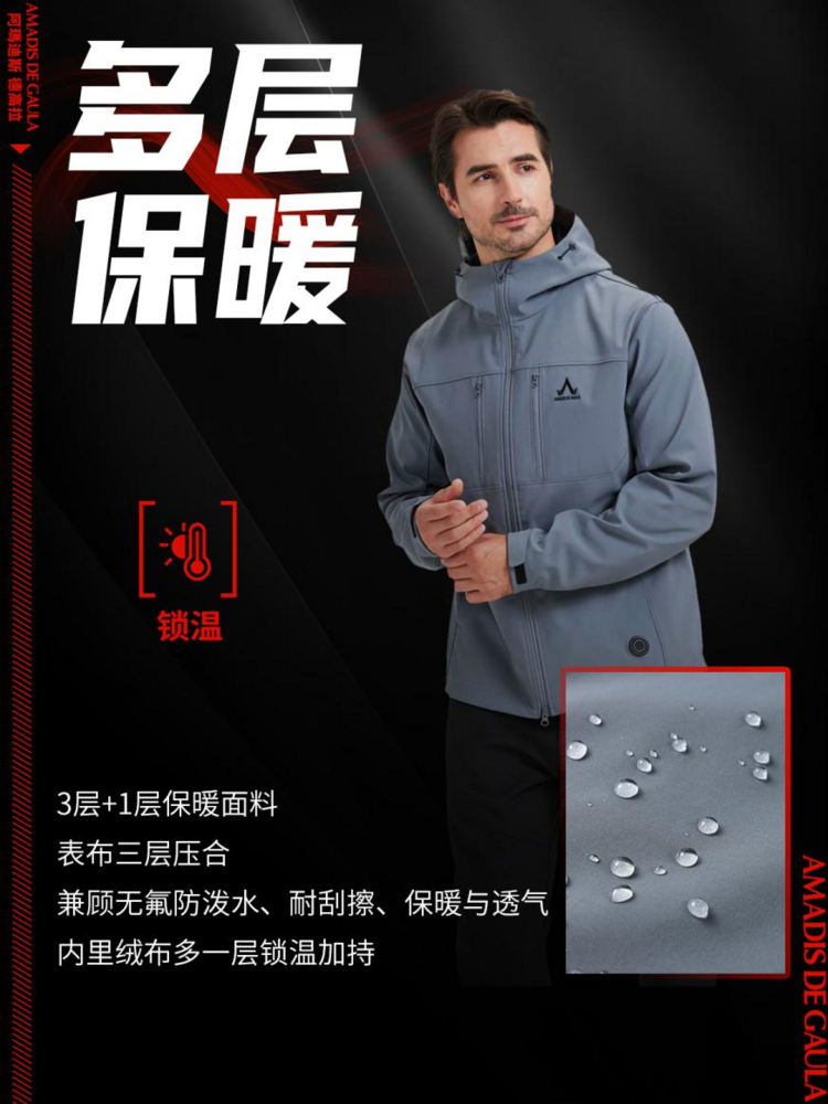 值得一提的是,阿玛迪斯防风软壳外套还突破行业技术瓶颈,内置智能加热系统,其智能温控模块可实现3-8小时持续供热,更实现“全衣无忧机洗”,解决了智能服装清洗难的行业通病,成为行业标杆。