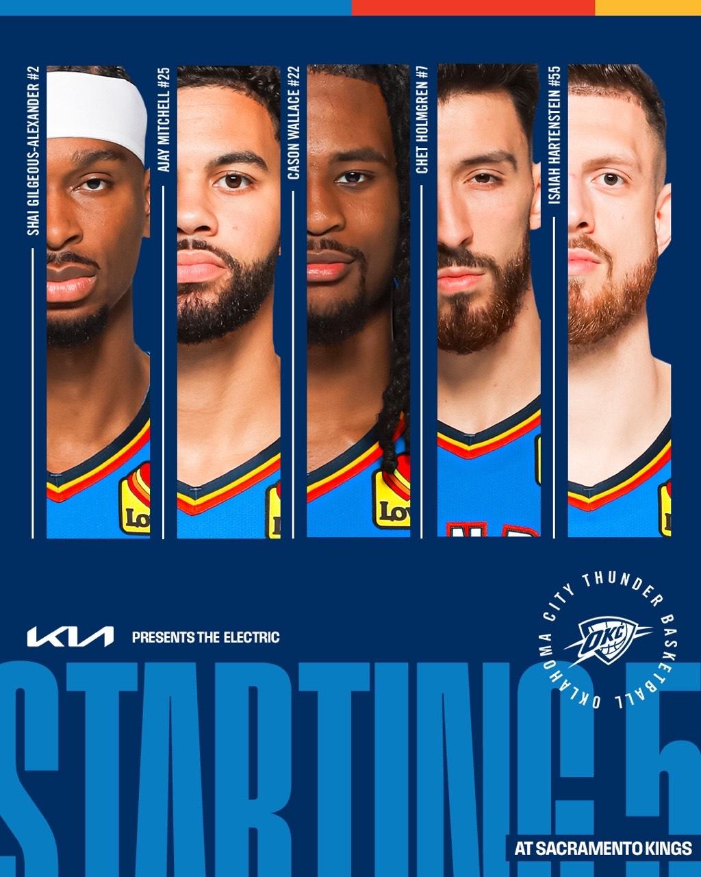 赛前,雷霆公布球队本场首发阵容:谢伊-吉尔杰斯-亚历山大、阿杰伊-米切尔、卡森-华莱士、切特-霍姆格伦和以赛亚-哈尔滕施泰因。