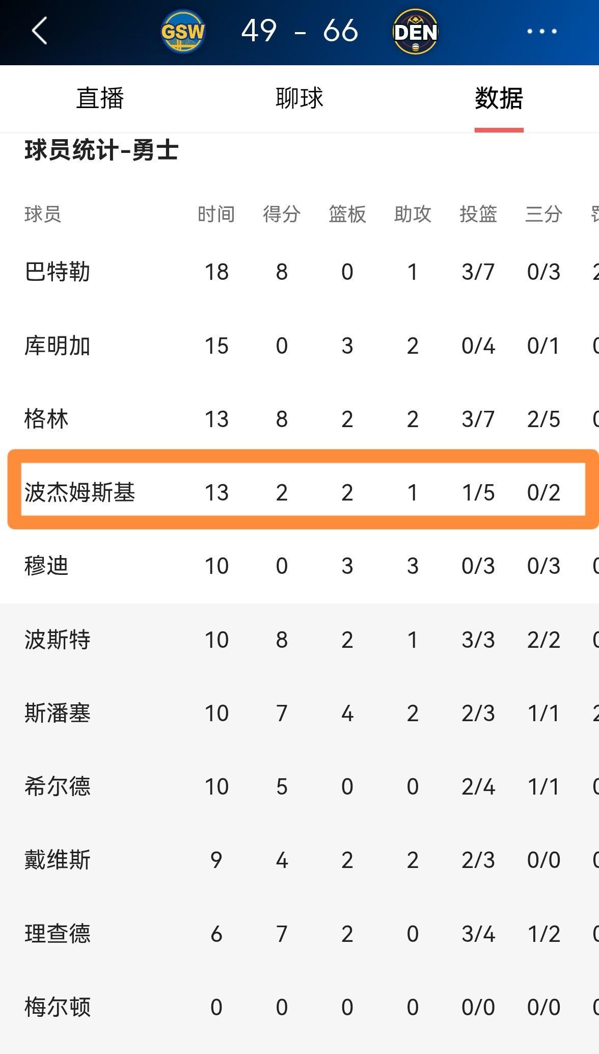勇士新星波杰姆斯基真是特别的拉胯!在今天勇士客场挑战掘金的上半场比赛中,波杰姆斯基首发出战13分钟,投篮5中1,其中三分球2中0仅仅得到2分,还有2次失误,他的场上正负值为全队第二低的-18。 从波杰姆斯基在上半场比赛中的表现来看,他真是毫无斗志,我觉得他完全没有做好打球的准备。